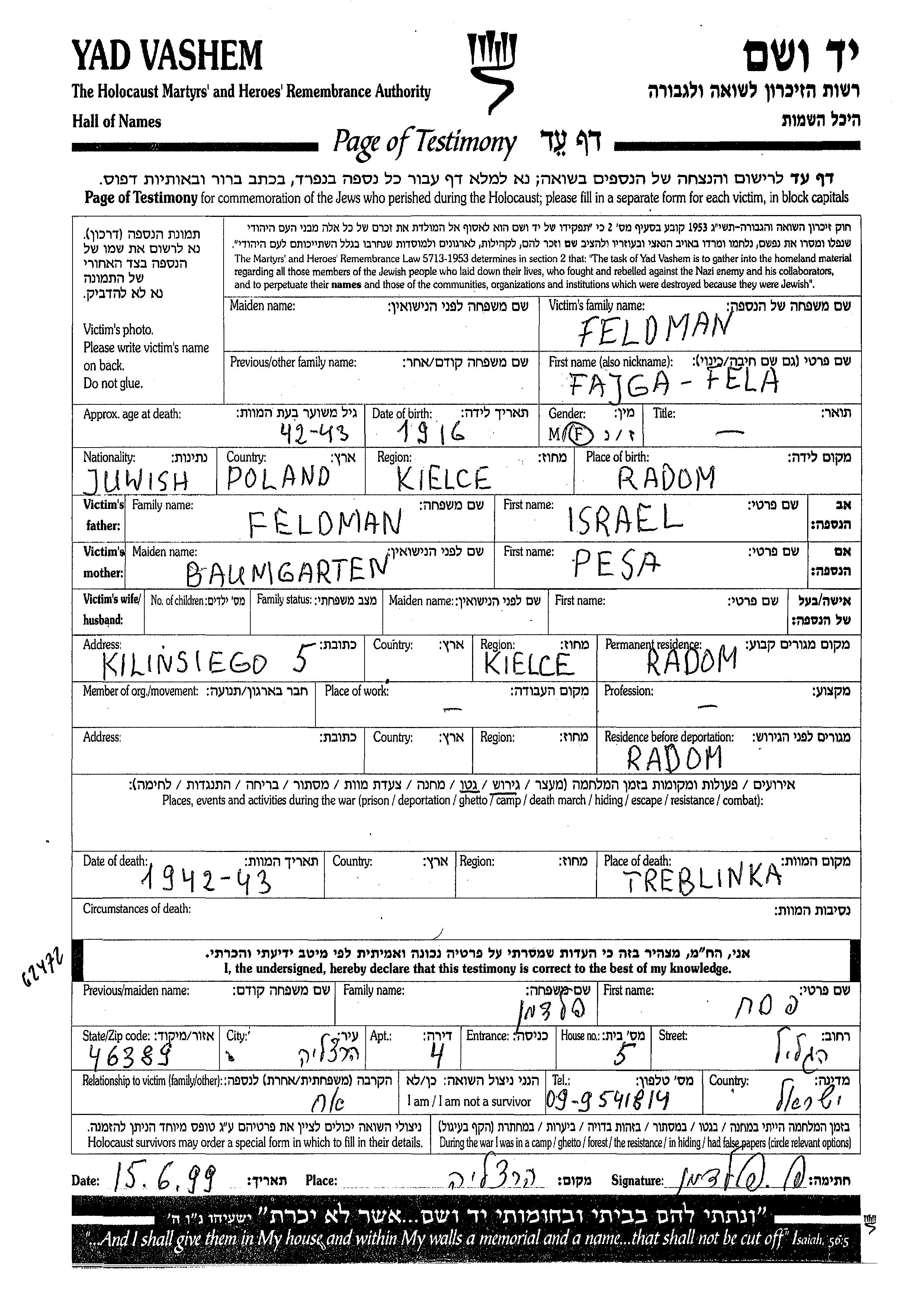 Fajga Fela Feldman wurde im Jahr 1916 in Radom, Polen geboren. Sie war die Tochter von Israel und Pesa. Vor dem Zweiten Weltkrieg lebte sie in Radom, Polen. Während des Krieges war sie in Radom, Polen.