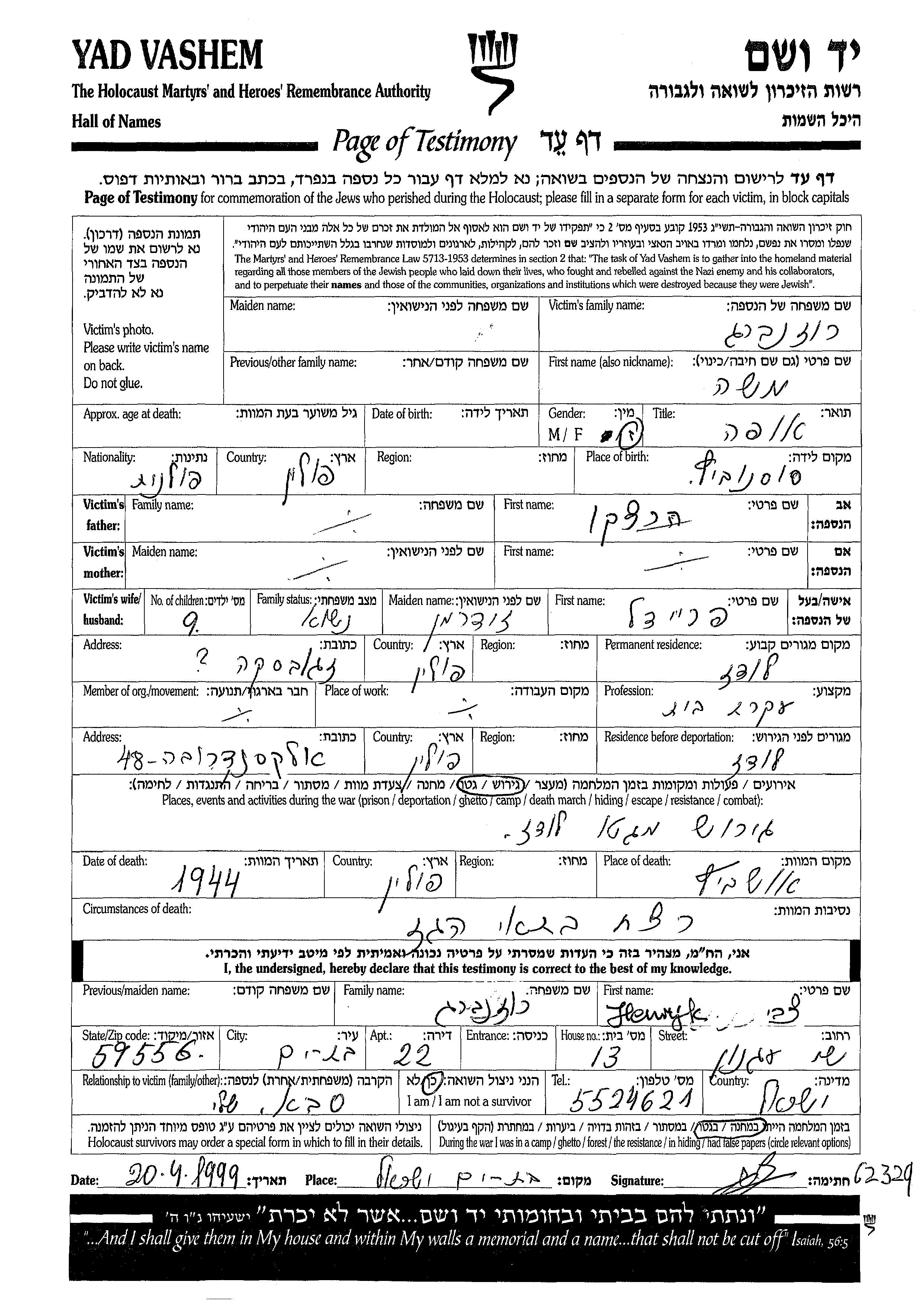 Rozenberg Moshe Lodz, Polen Gedenkblatt
