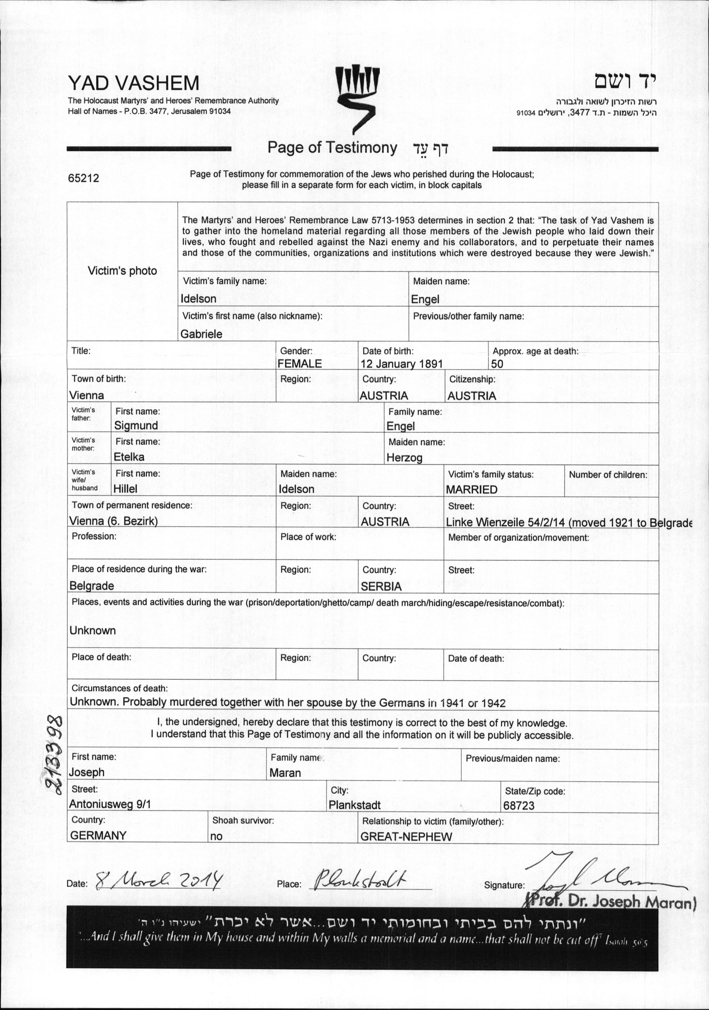 Gabriele Idelson, geb. Engel wurde im Jahr 1891 in Vienna, Österreich geboren. Sie war die Tochter von Sigmund und Etelka, geb. Herzog. Sie war mit Hillel Verheiratet. Vor dem Zweiten Weltkrieg lebte sie in Belgrad, Jugoslawien. Während des Krieges war sie in Belgrad, Jugoslawien.