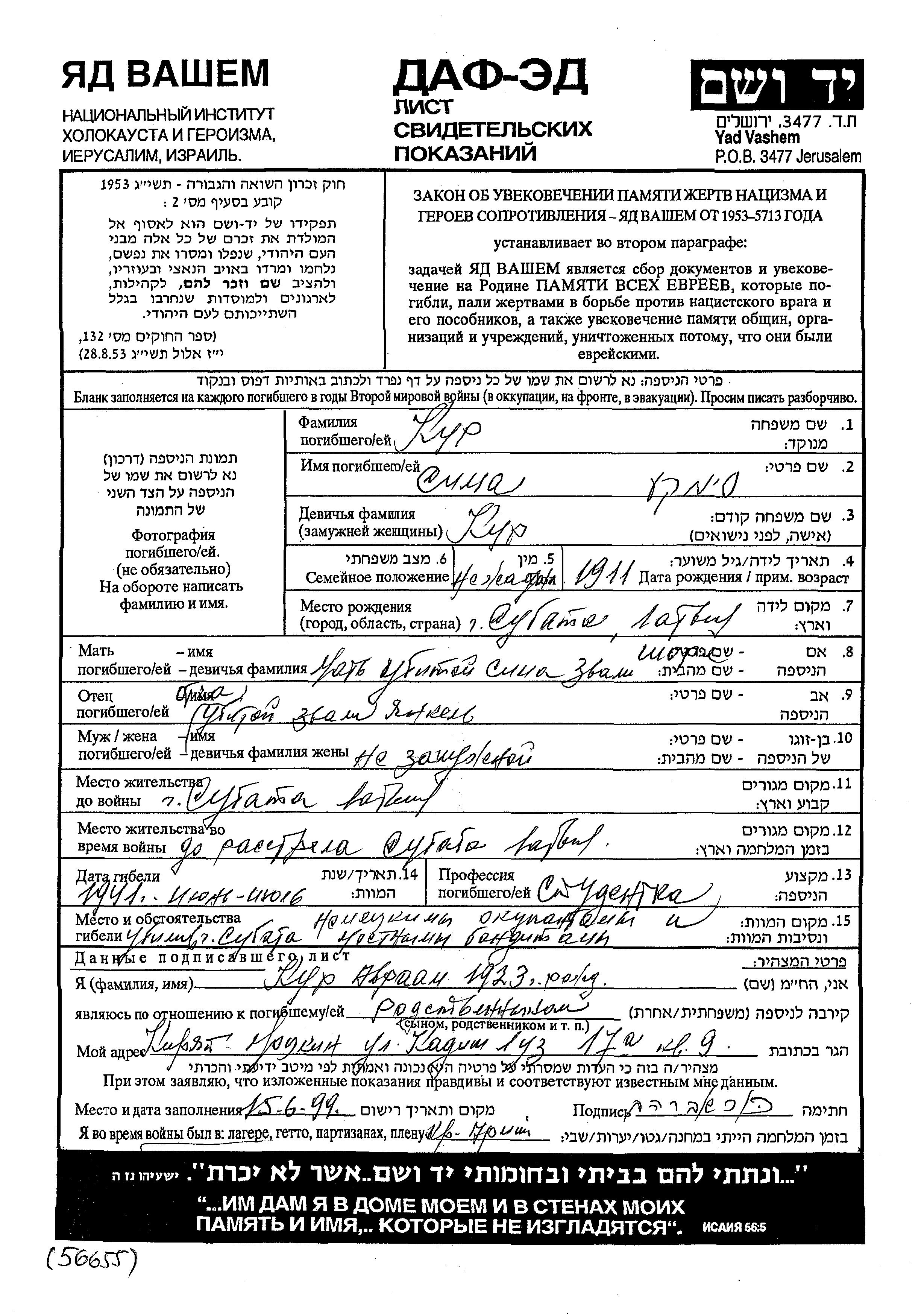 Simkha Sima Name unbekannt wurde im Jahr 1911 in Sulat, Litauen geboren. Sie war die Tochter von Yankel und Shore. Sie war Student und Ledig. Vor dem Zweiten Weltkrieg lebte sie in Sulat, Litauen. Während des Krieges war sie in Sulat, Litauen.