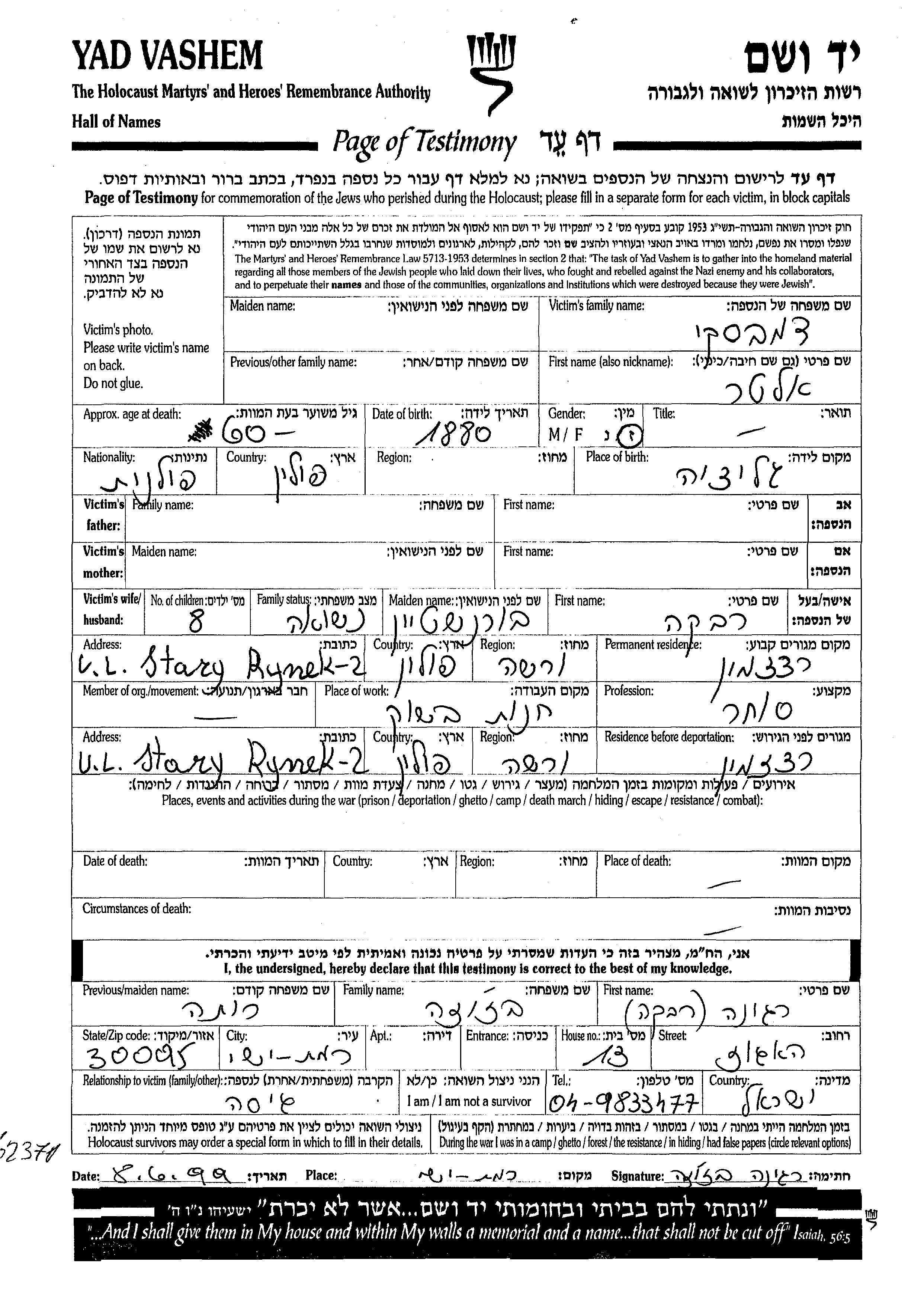 Alter Dembski wurde im Jahr 1880 in Galizien Region, Polen geboren. Er war Kaufmann/-frau und mit Rivka, geb. Bornshtein Verheiratet. Vor dem Zweiten Weltkrieg lebte er in Radzimin, Polen. Während des Krieges war er in Radzimin, Polen.