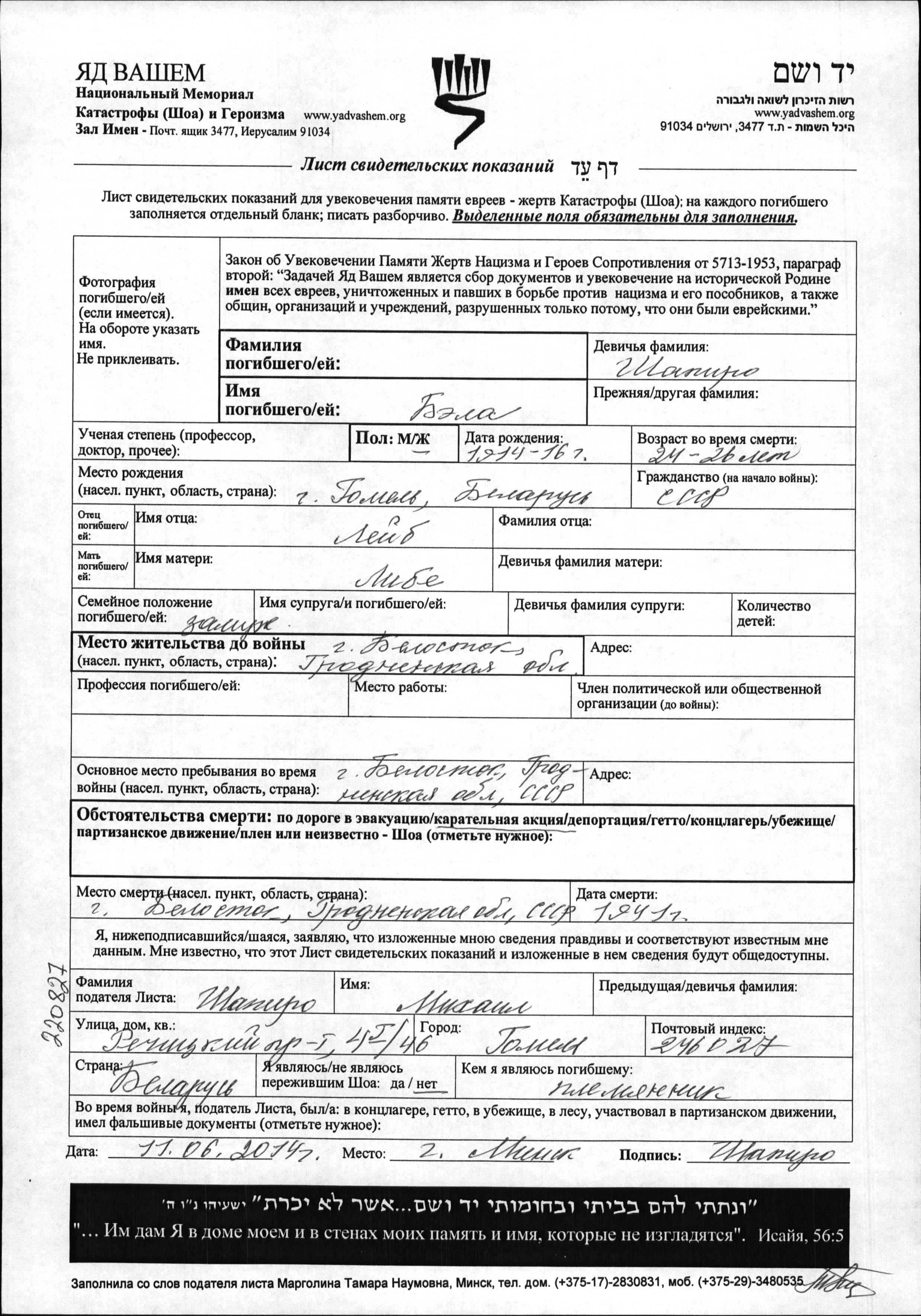 Bela Name unbekannt, geb. Shapiro wurde in Gomel, Weißrussland (UdSSR) geboren. Sie war die Tochter von Leyb und Libe. Sie war Verheiratet. Vor dem Zweiten Weltkrieg lebte sie in Belostok, Polen. Während des Krieges war sie in Belostok, Polen.
