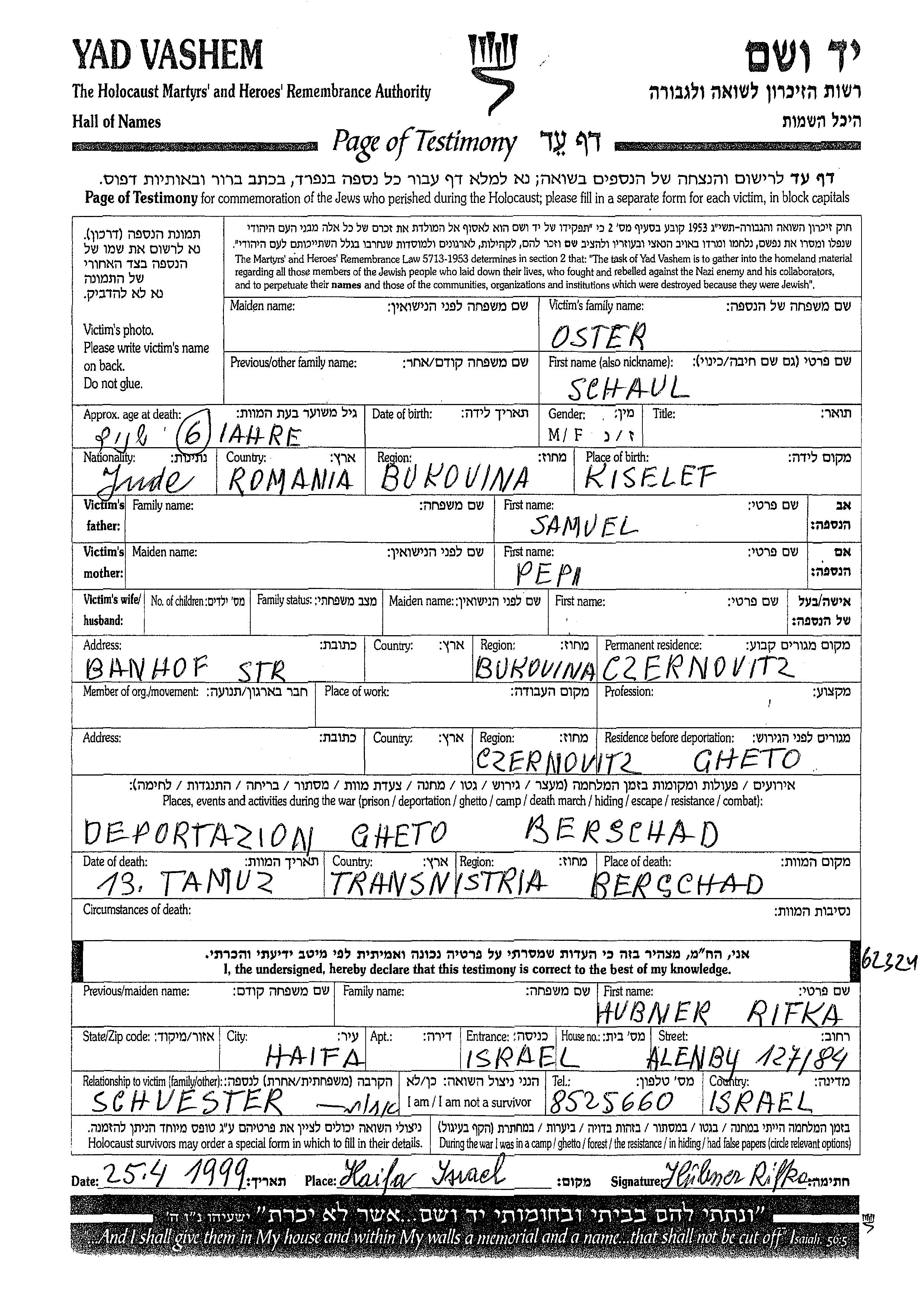 Schaul wurde in der Schoah ermordet. Todesort: Bershad, Ukraine (UdSSR).