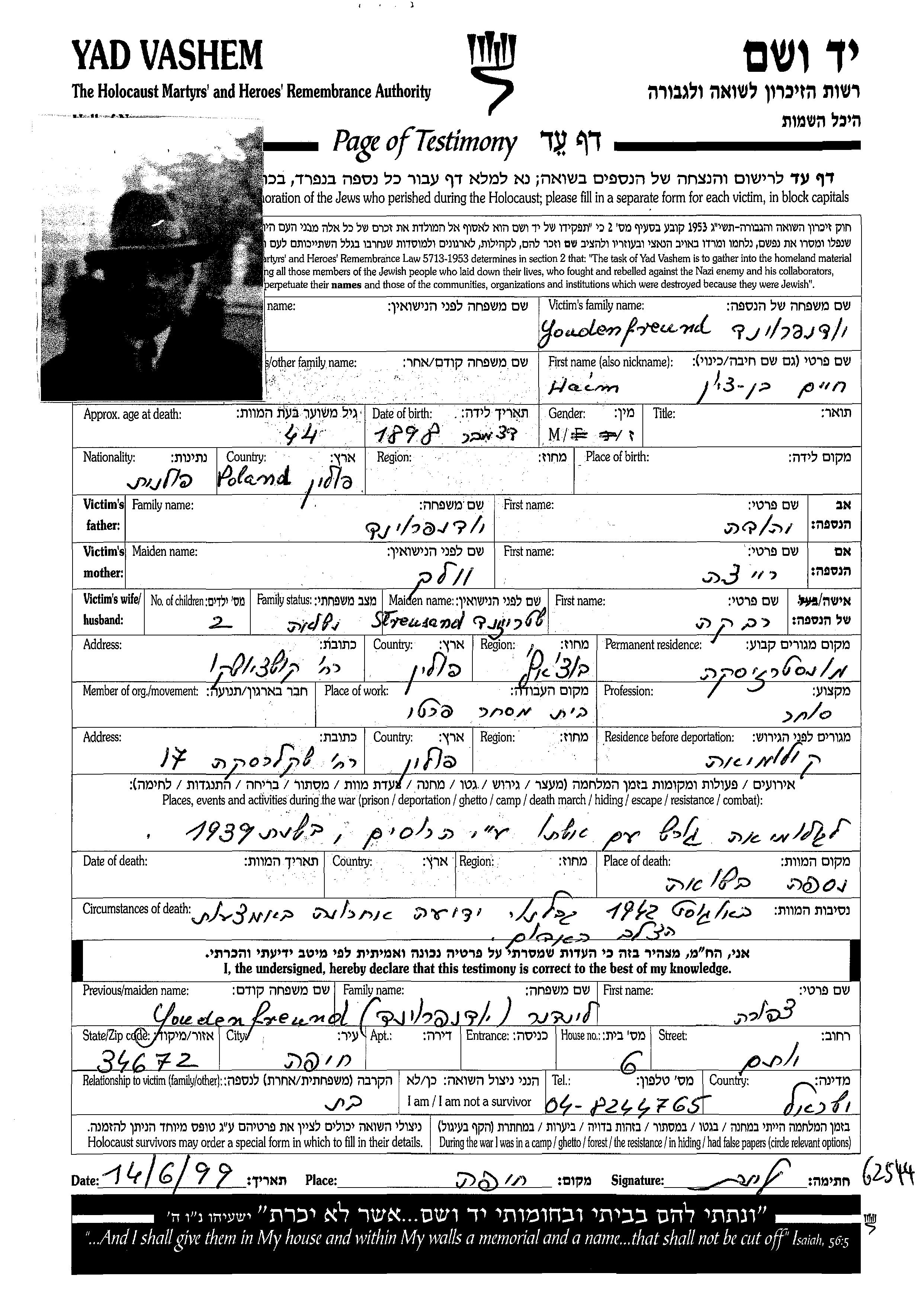 Khaim Bentzion Youdenfreund wurde im Jahr 1898 geboren. Er war Kaufmann/-frau. Vor dem Zweiten Weltkrieg lebte er in Monasterzyska, Polen.