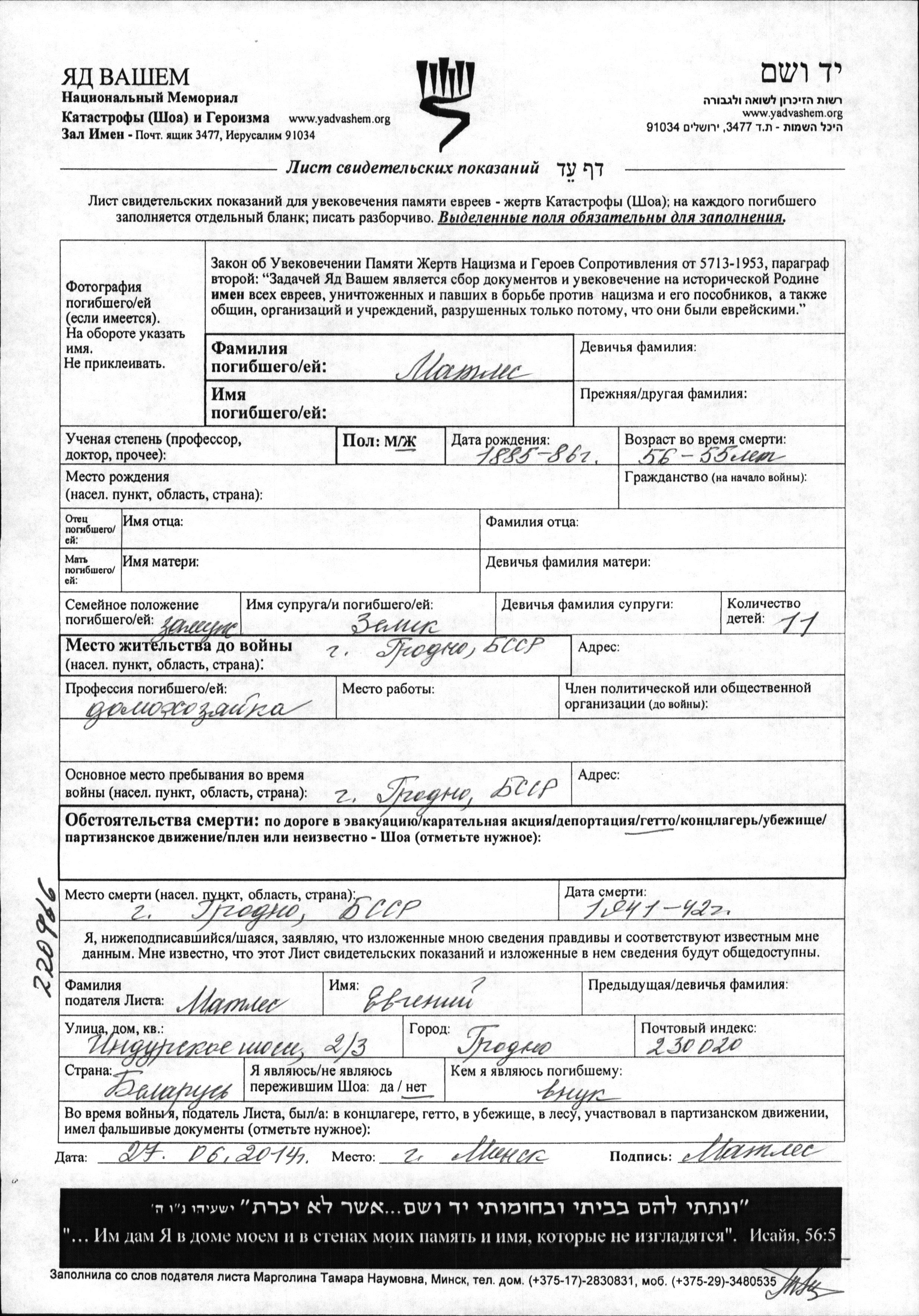 Vorname unbekannt Matles wurde im Jahr 1885 geboren. Sie war Hausfrau und mit Zelik Verheiratet. Vor dem Zweiten Weltkrieg lebte sie in Grodno, Polen. Während des Krieges war sie in Grodno, Polen.