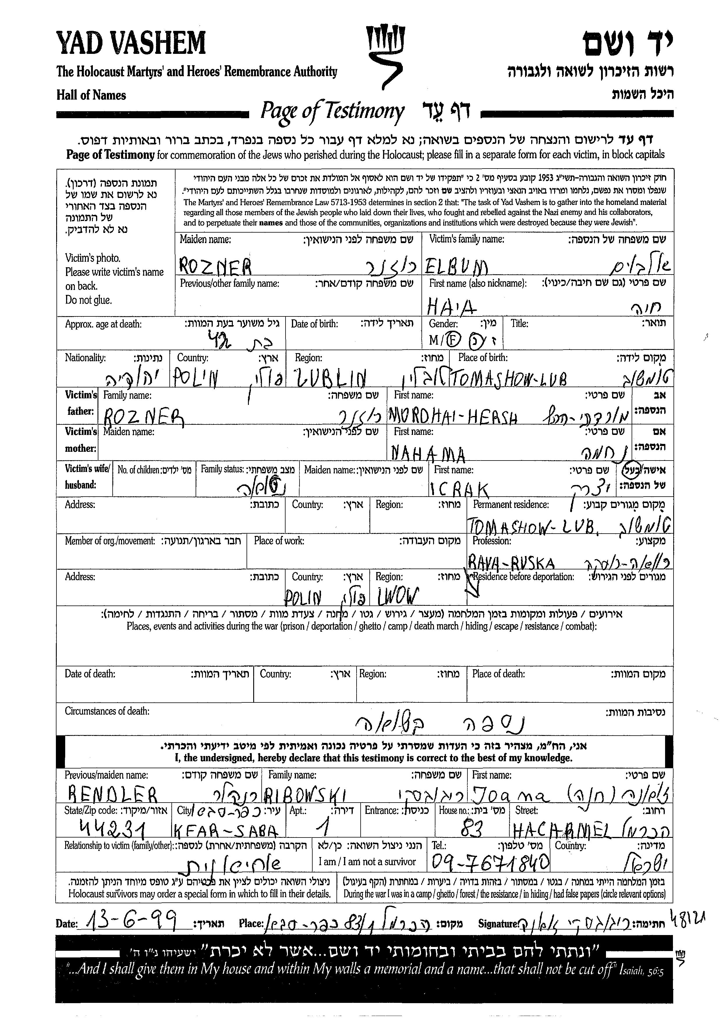 Haia Elbum, geb. Rozner wurde in Tomaszow Lubelski, Polen geboren. Sie war die Tochter von Mordhai Hersh und Nahama Nekhama. Sie war mit Ichak Verheiratet. Vor dem Zweiten Weltkrieg lebte sie in Tomaszow Lubelski, Polen. Während des Krieges war sie in Rawa Ruska, Polen.
