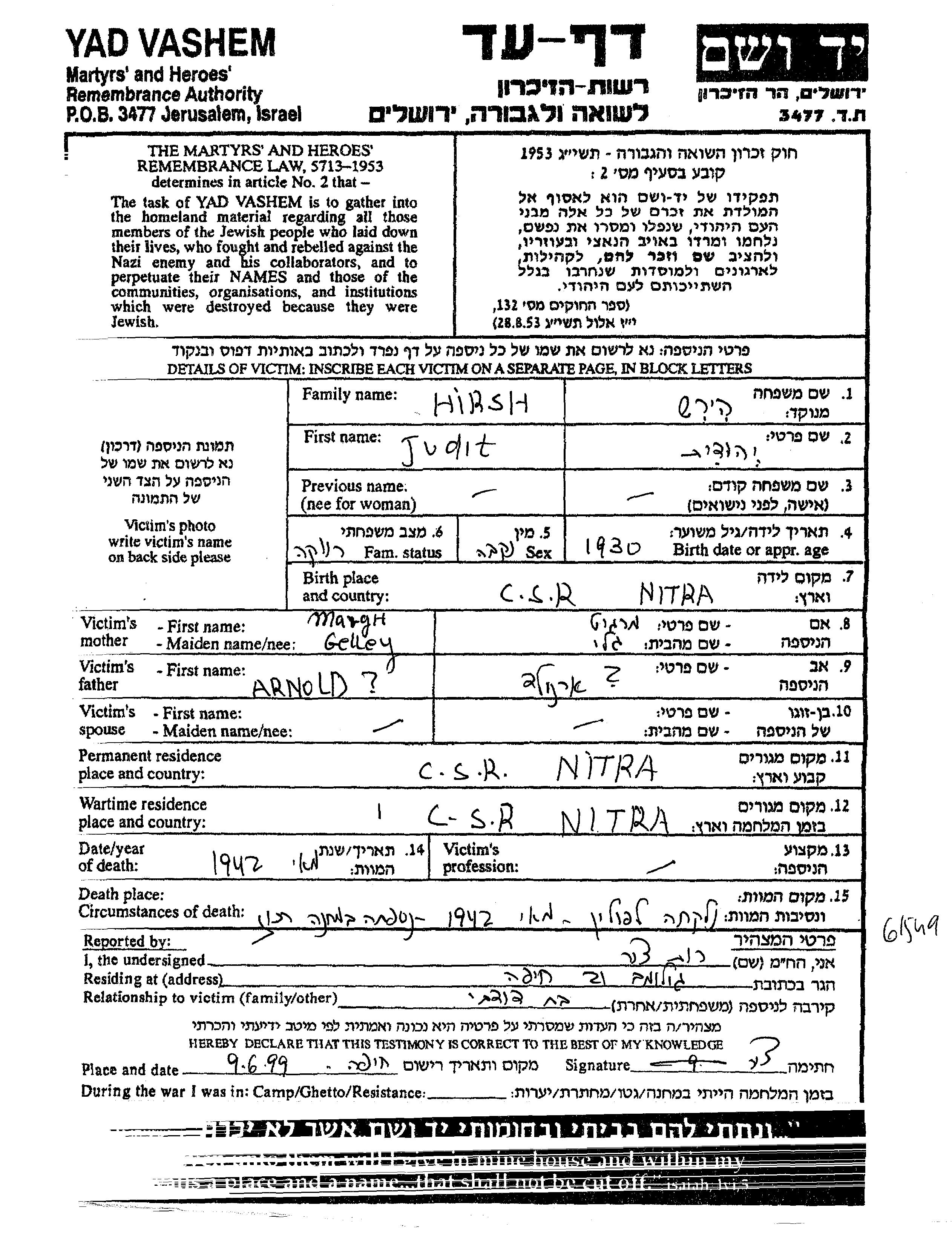 Hirsh Judit 1930 Nitra, Tschechoslowakei Gedenkblatt