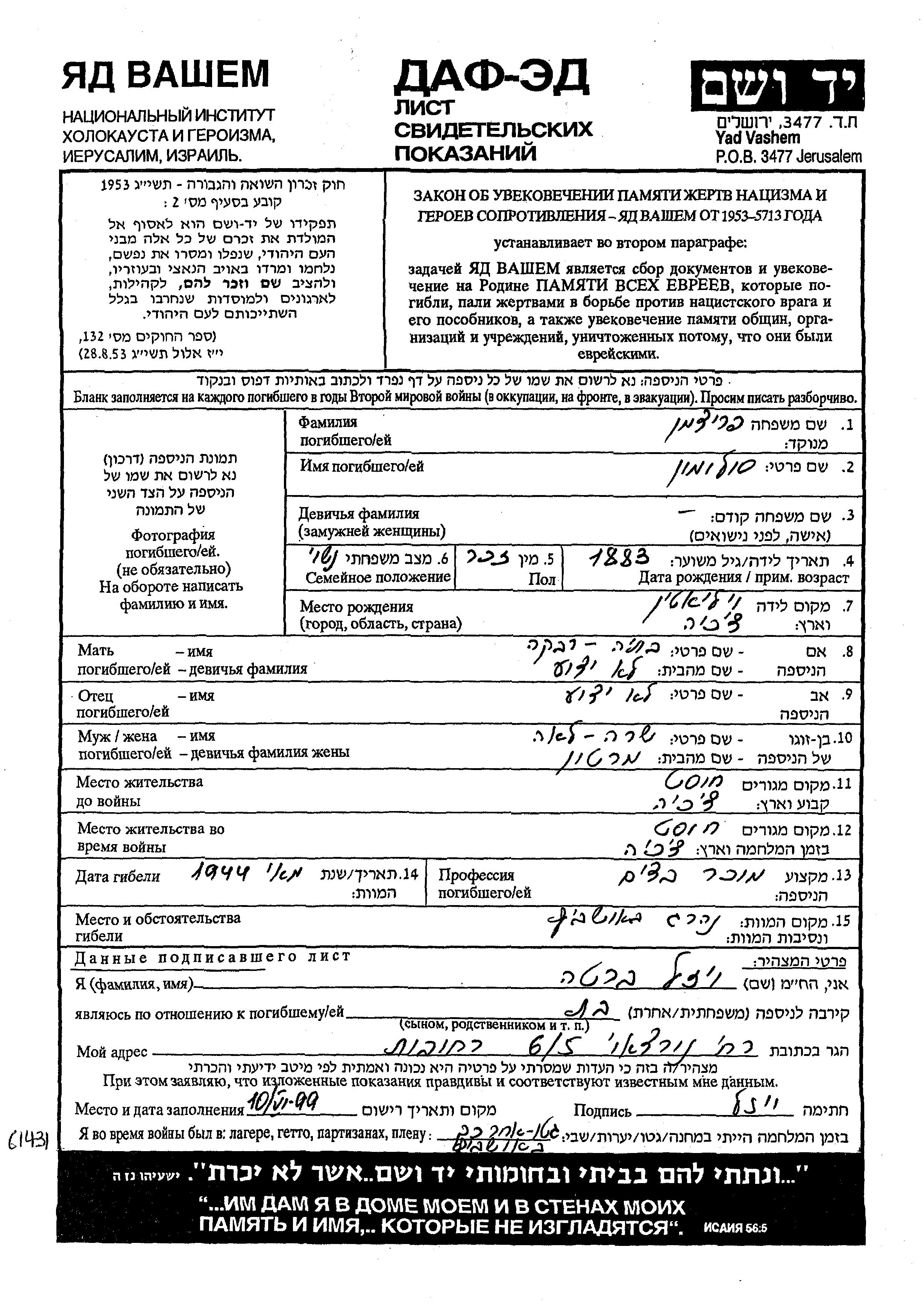 Fridman Solomon 1883 Hust, Tschechoslowakei Gedenkblatt
