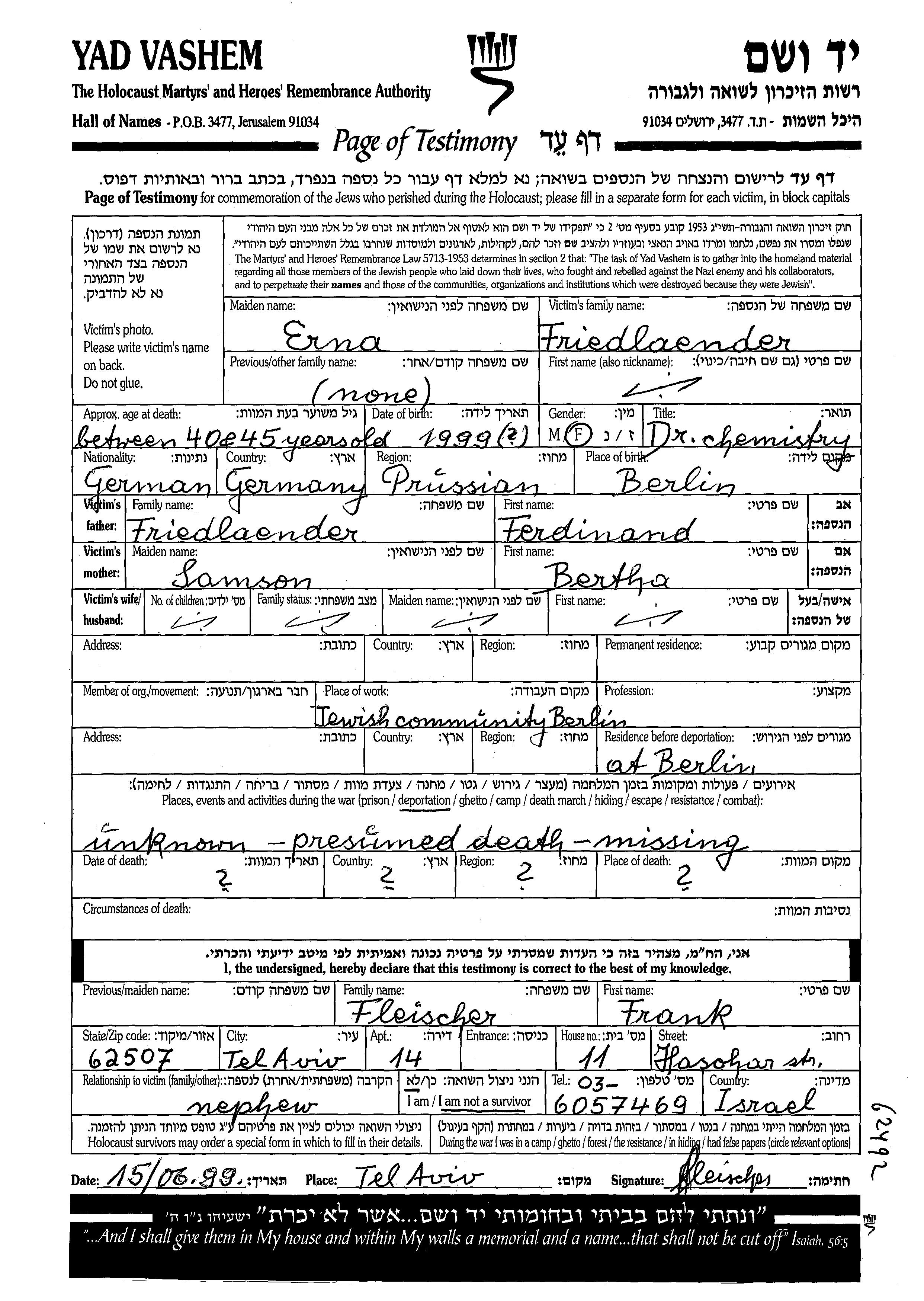Friedländer Erna 1894 Berlin, Deutsches Reich Gedenkblatt