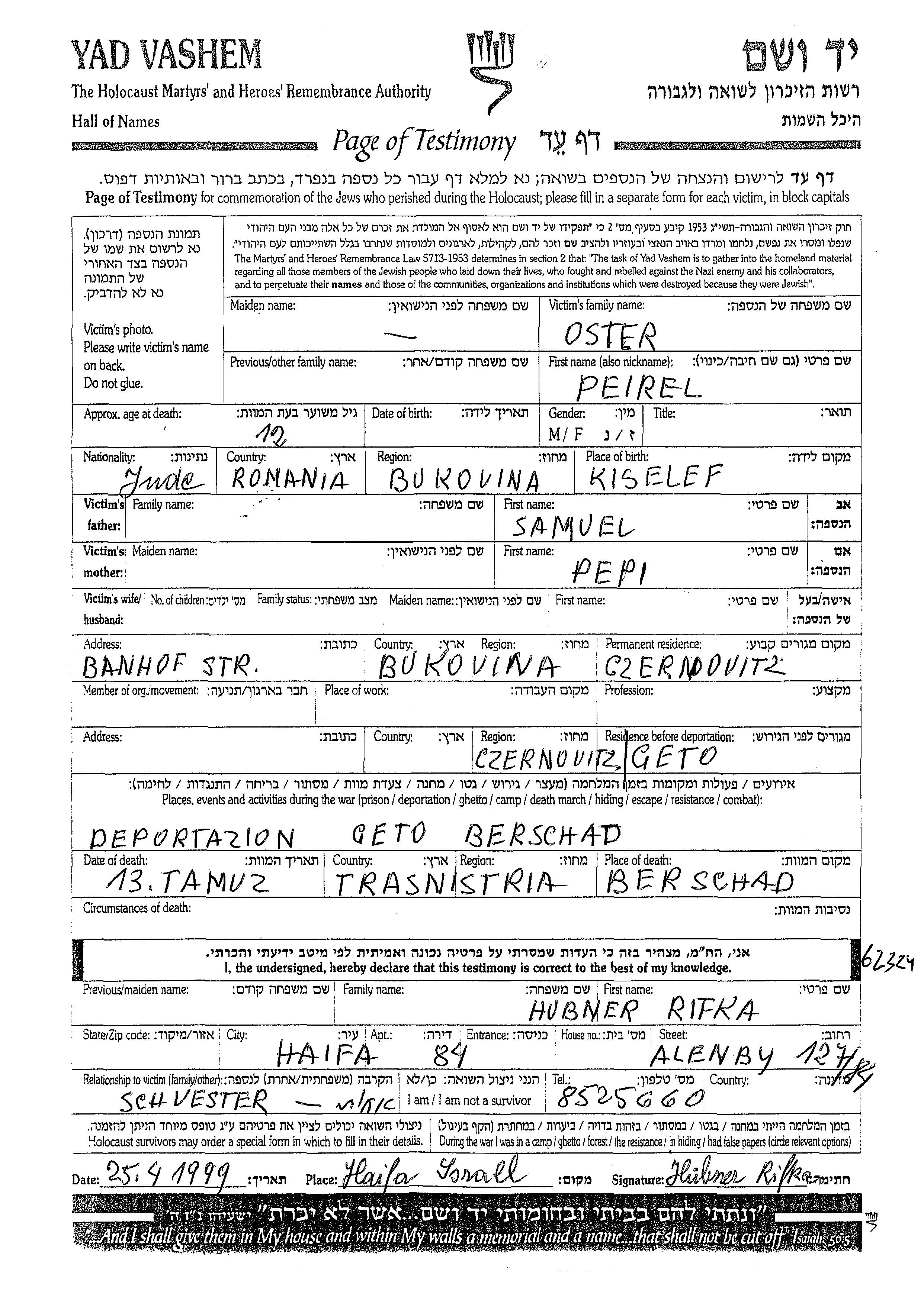 Peirel wurde in der Schoah ermordet. Todesort: Berschad, Ukraine (UdSSR).