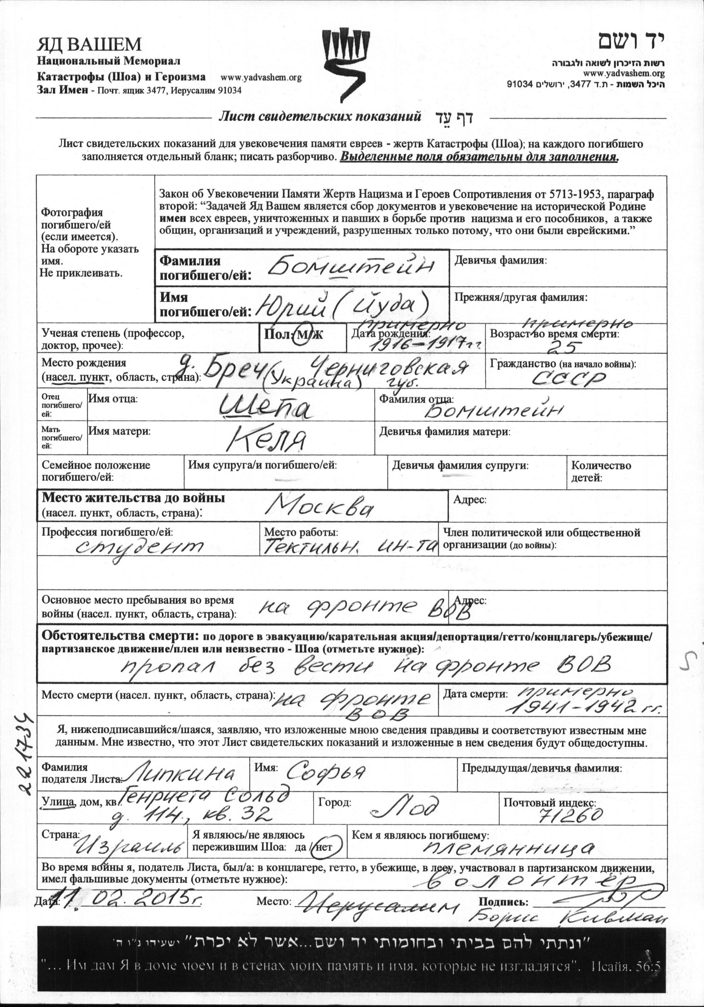 Yuri Yuda Bomshteyn wurde im Jahr 1916 in Brech, Ukraine (UdSSR) geboren. Er war der Sohn von Shepa und Kelya. Er war Student. Vor dem Zweiten Weltkrieg lebte er in Moskva, Russland (UdSSR). Während des Krieges war er in die Sowjetischen Streitkräfte.