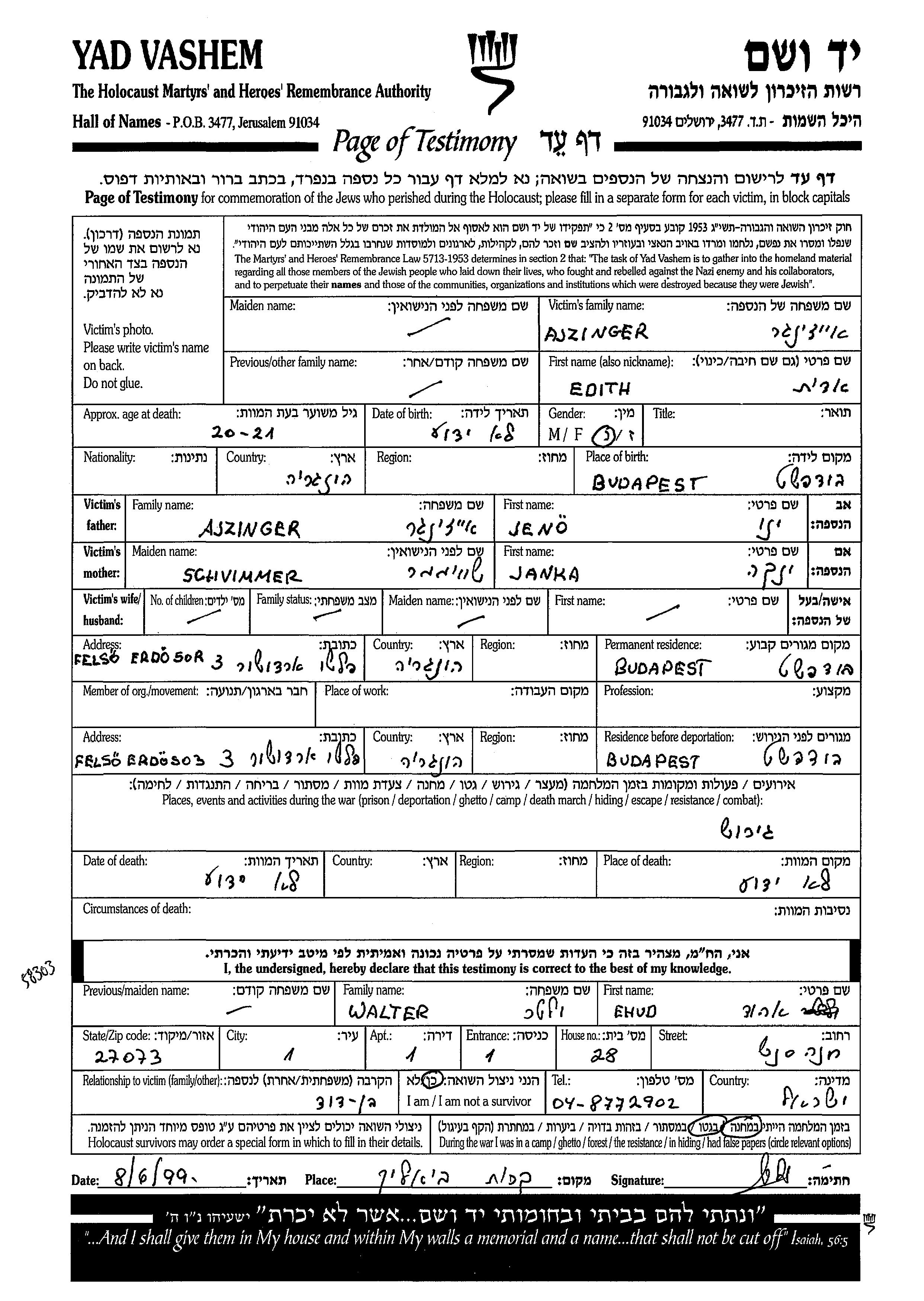 Edith Ajzinger wurde in Budapest, Ungarn geboren. Sie war die Tochter von Jeno und Janka. Sie war Ledig. Vor dem Zweiten Weltkrieg lebte sie in Budapest, Ungarn. Während des Krieges war sie in Budapest, Ungarn.