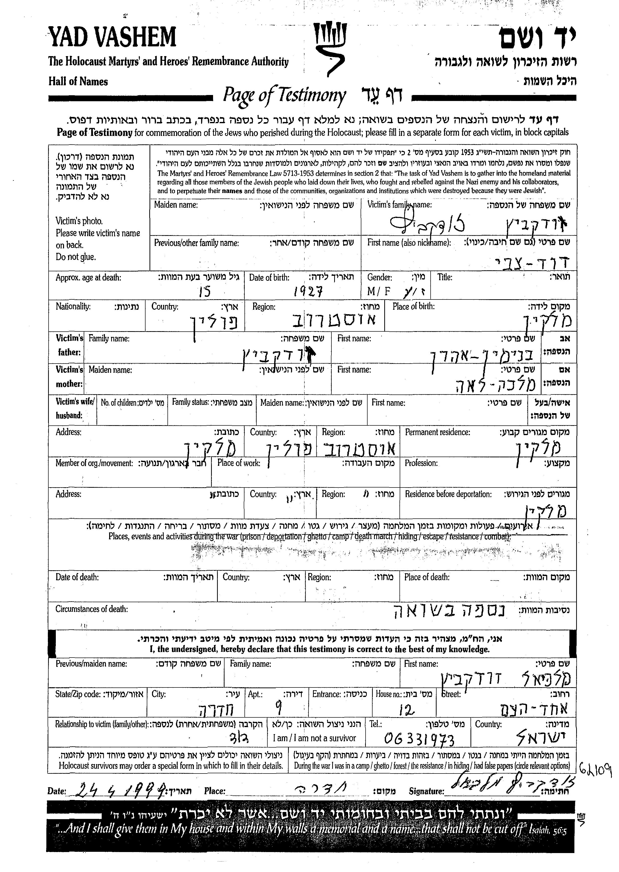 Zudkevitz David 1927 Malkin, Polen Gedenkblatt
