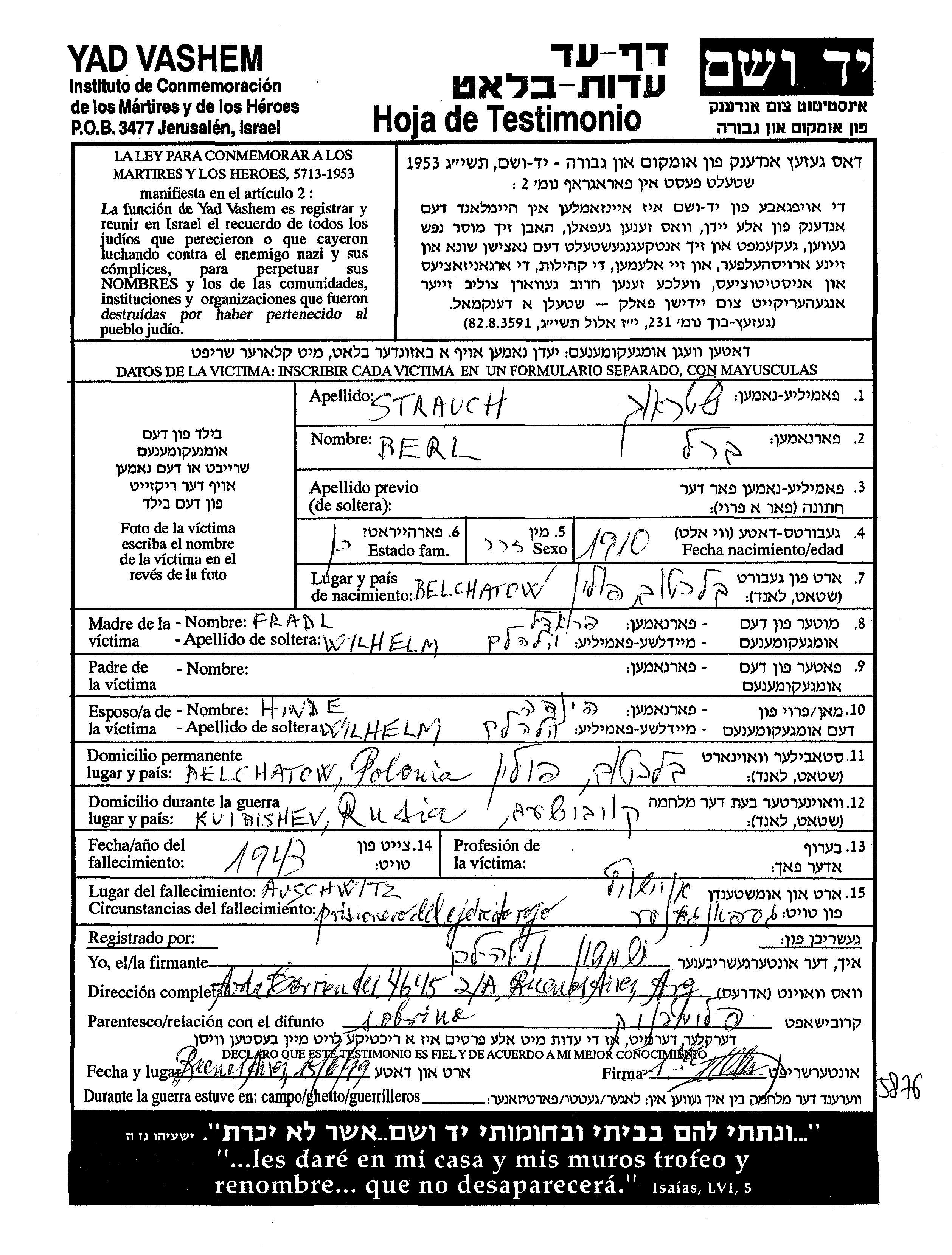 Berl Strauch wurde im Jahr 1910 in Bełchatów, Polen geboren. Er war der Sohn von Fradl Fradel. Vor dem Zweiten Weltkrieg lebte er in Bełchatów, Polen. Während des Krieges war er in Kuibyshev, Russland (UdSSR).