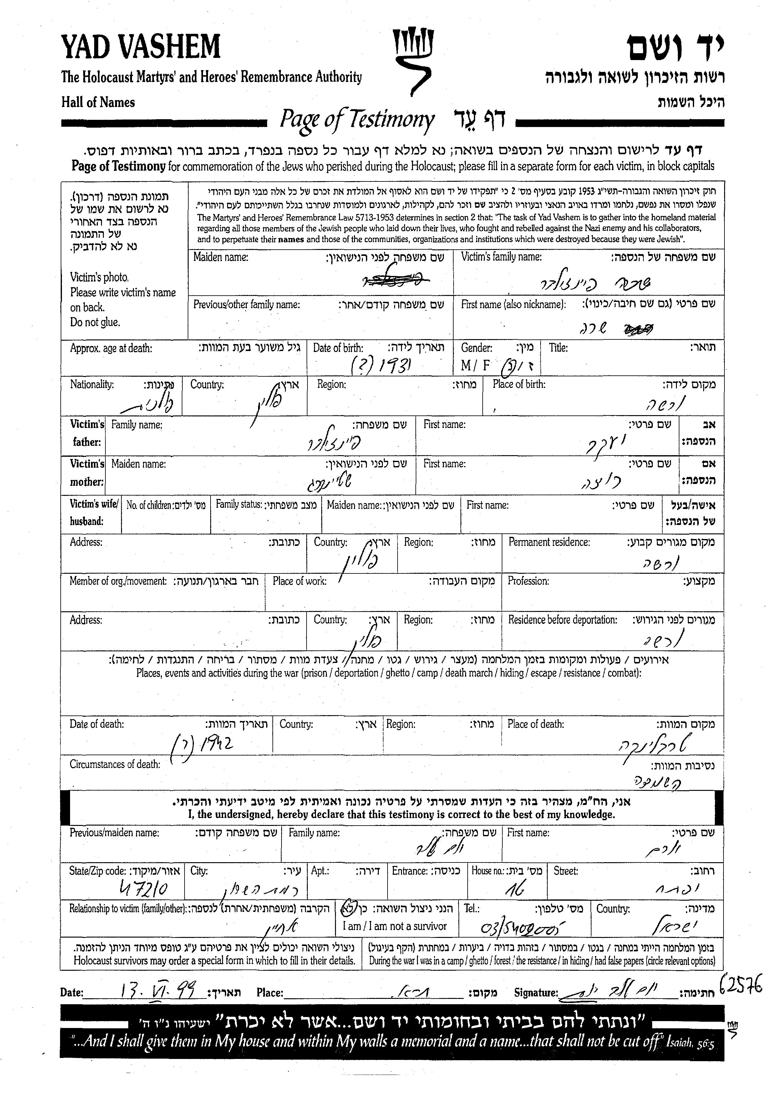Sara Feinzilber wurde im Jahr 1931 in Warsaw, Polen geboren. Sie war die Tochter von Yaakov und Roza. Vor dem Zweiten Weltkrieg lebte sie in Warsaw, Polen. Während des Krieges war sie in Warsaw, Polen.