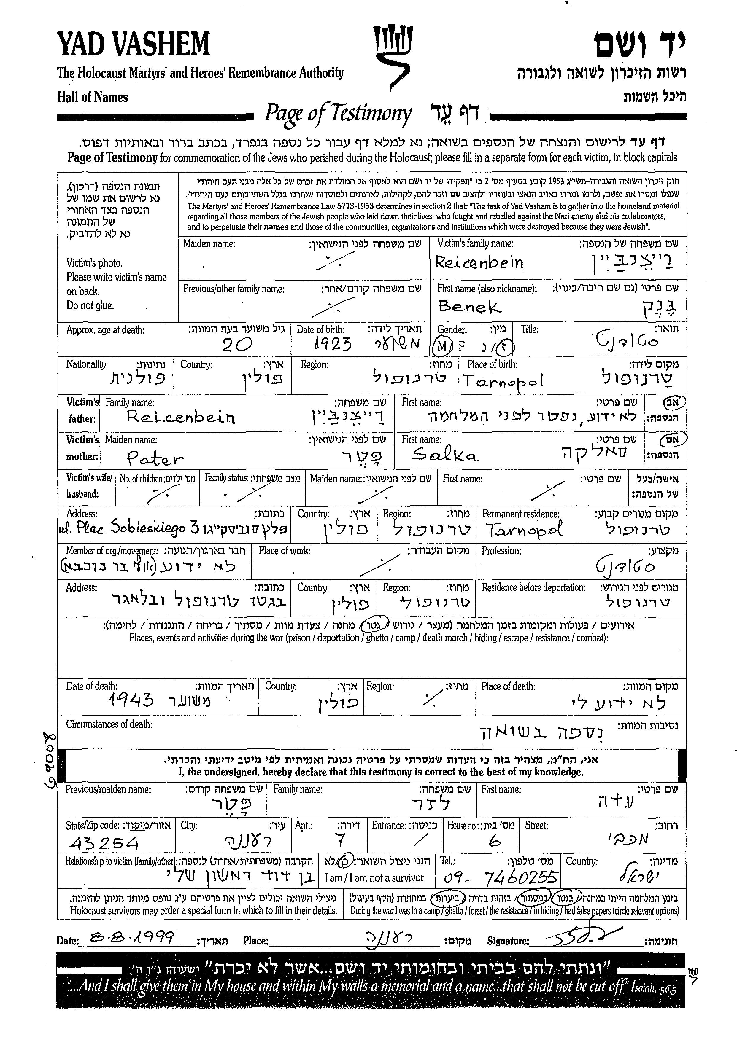 Benek Reicenbein wurde im Jahr 1923 in Tarnopol, Polen geboren. Er war der Sohn von Salka. Er war Student. Vor dem Zweiten Weltkrieg lebte er in Tarnopol, Polen. Während des Krieges war er in Tarnopol, Polen.