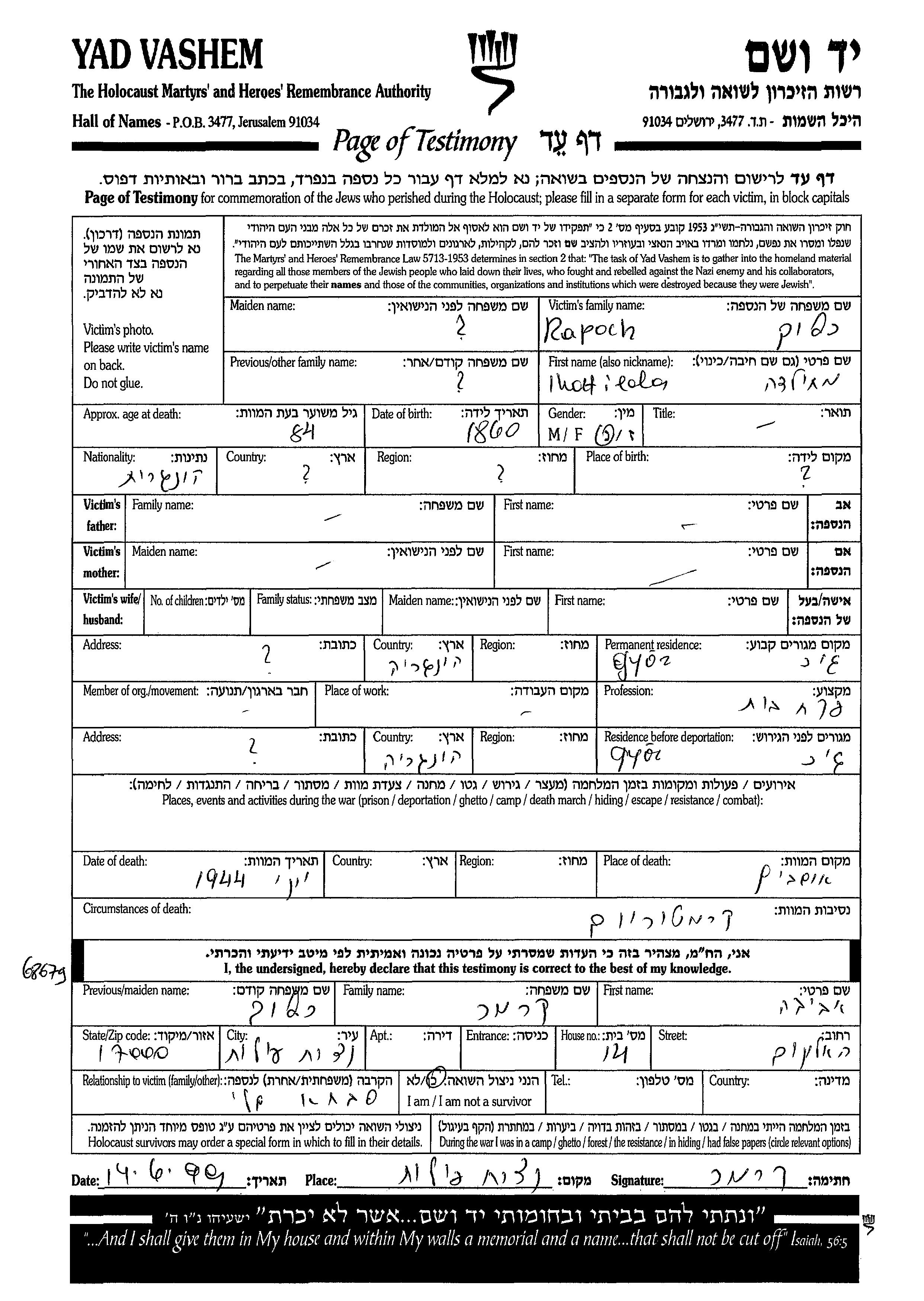 Mattilda Rapoch wurde im Jahr 1860 geboren. Sie war Hausfrau. Vor dem Zweiten Weltkrieg lebte sie in Gyor, Ungarn. Während des Krieges war sie in Gyor, Ungarn.