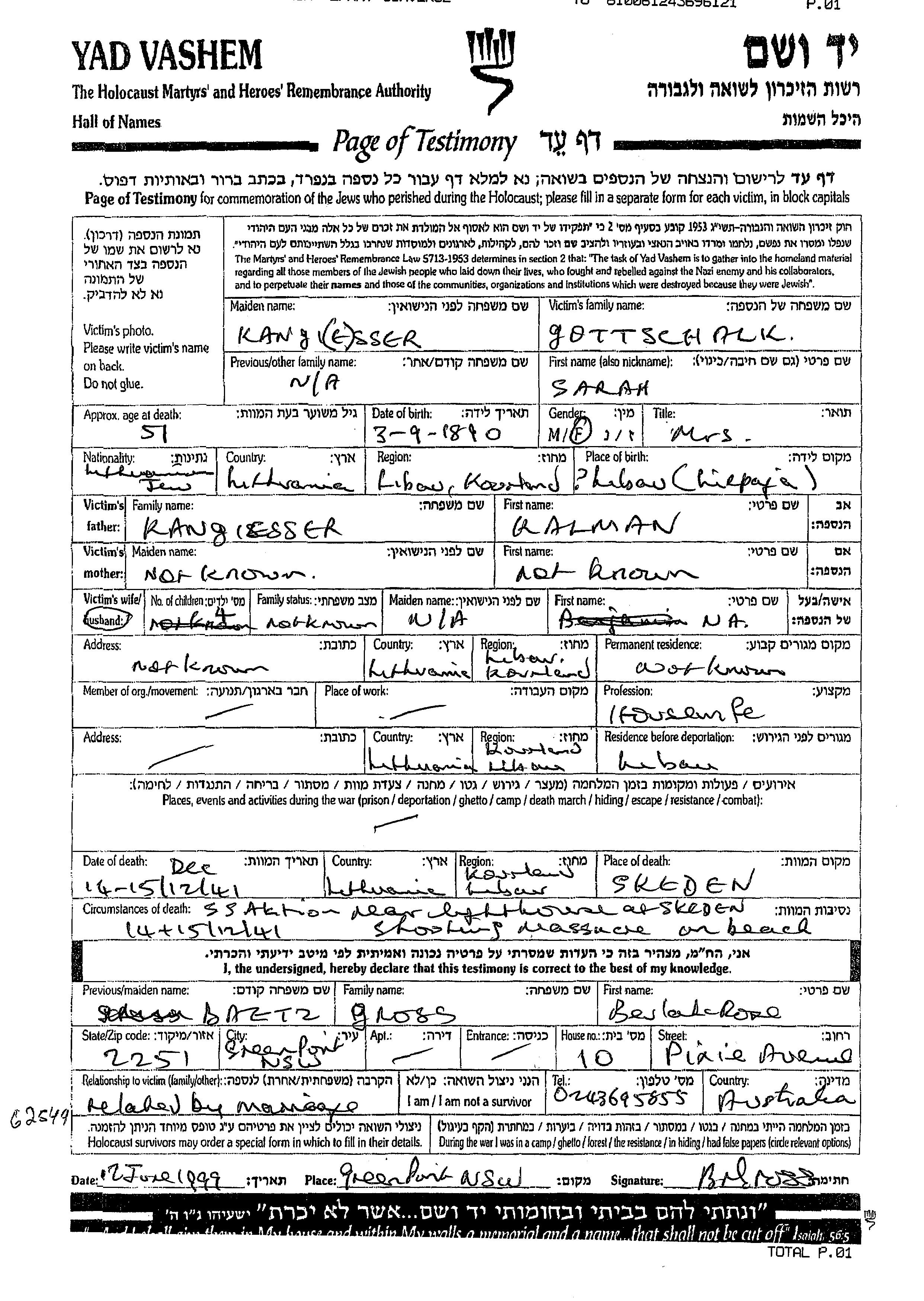 Sarah Gottschalk, geb. Kangiesser wurde im Jahr 1890 in Libau, Lettland geboren. Sie war die Tochter von Kalman. Sie war Hausfrau. Vor dem Zweiten Weltkrieg lebte sie in Libau, Lettland. Während des Krieges war sie in Libau, Lettland.