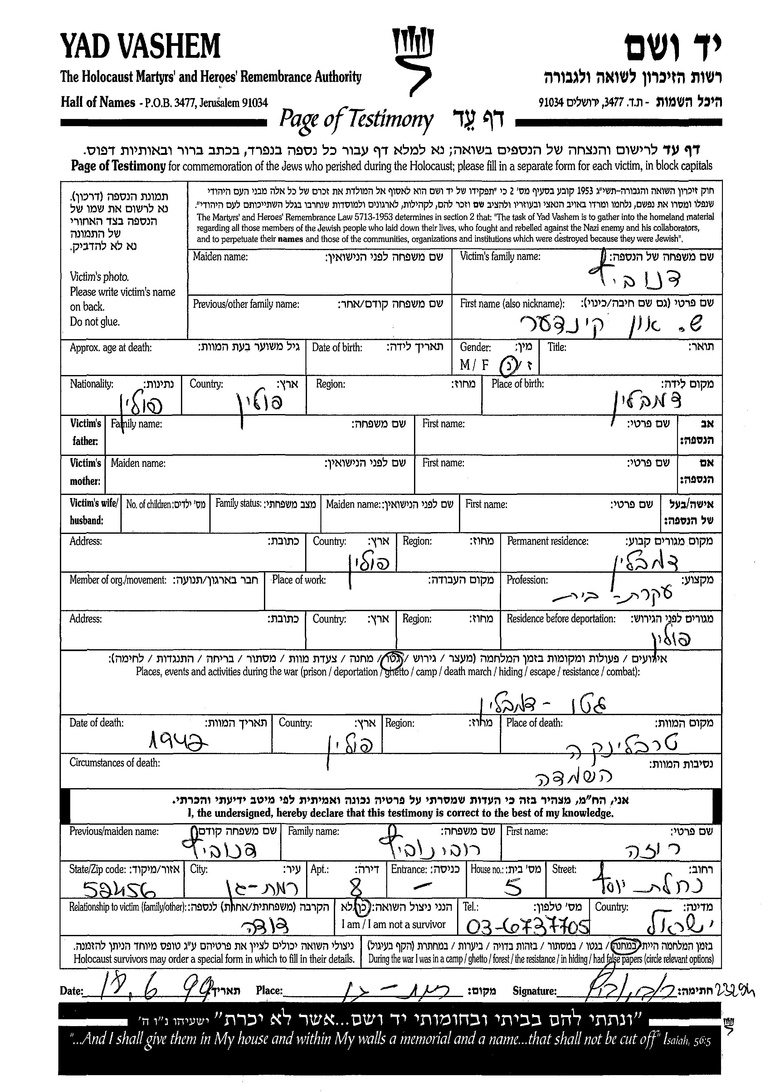 S wurde in der Schoah ermordet. Todesort: Treblinka, Polen im Jahr 1942.