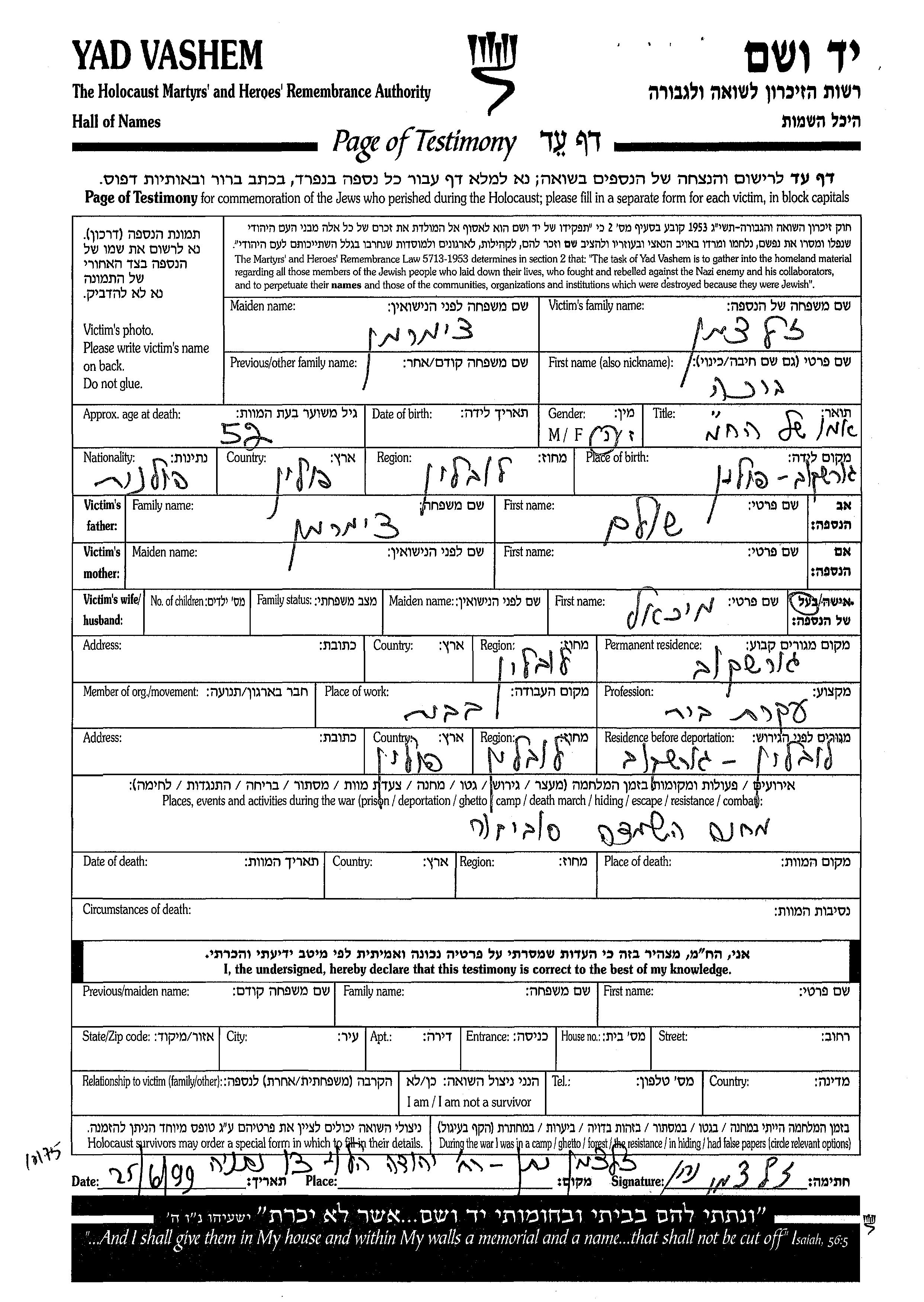 Brakha Zaltzman, geb. Tzimerman wurde in Gorshkov, Polen geboren. Sie war die Tochter von Shalom. Sie war Hausfrau und mit Mikhael Verheiratet. Vor dem Zweiten Weltkrieg lebte sie in Gorshkov, Polen. Während des Krieges war sie in Gorshkov, Polen.
