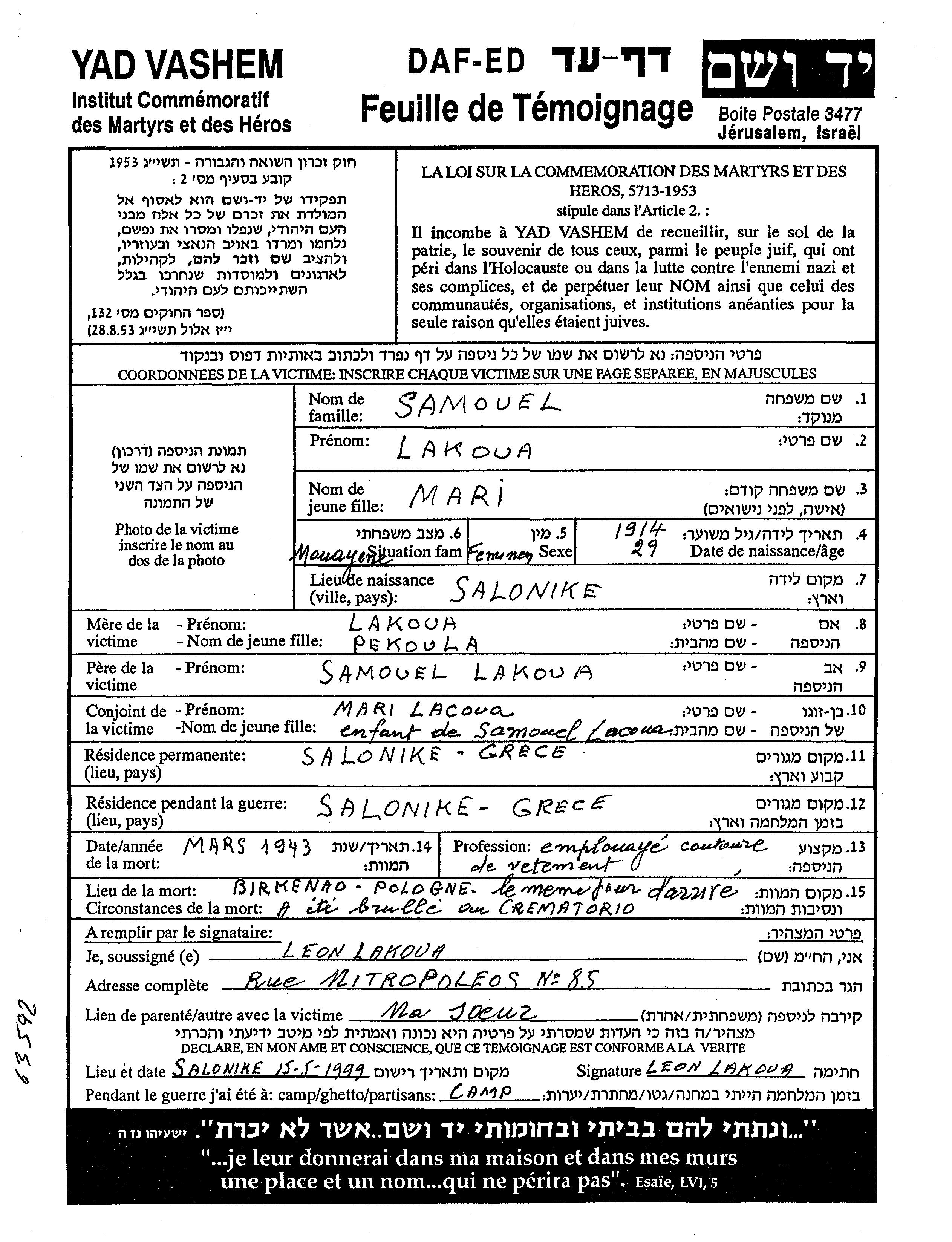 Mari Lacoua wurde im Jahr 1914 in Saloniki, Griechenland geboren. Sie war die Tochter von Samouel und Pekoula. Sie war Schneiderin und Ledig. Vor dem Zweiten Weltkrieg lebte sie in Saloniki, Griechenland. Während des Krieges war sie in Saloniki, Griechenland.