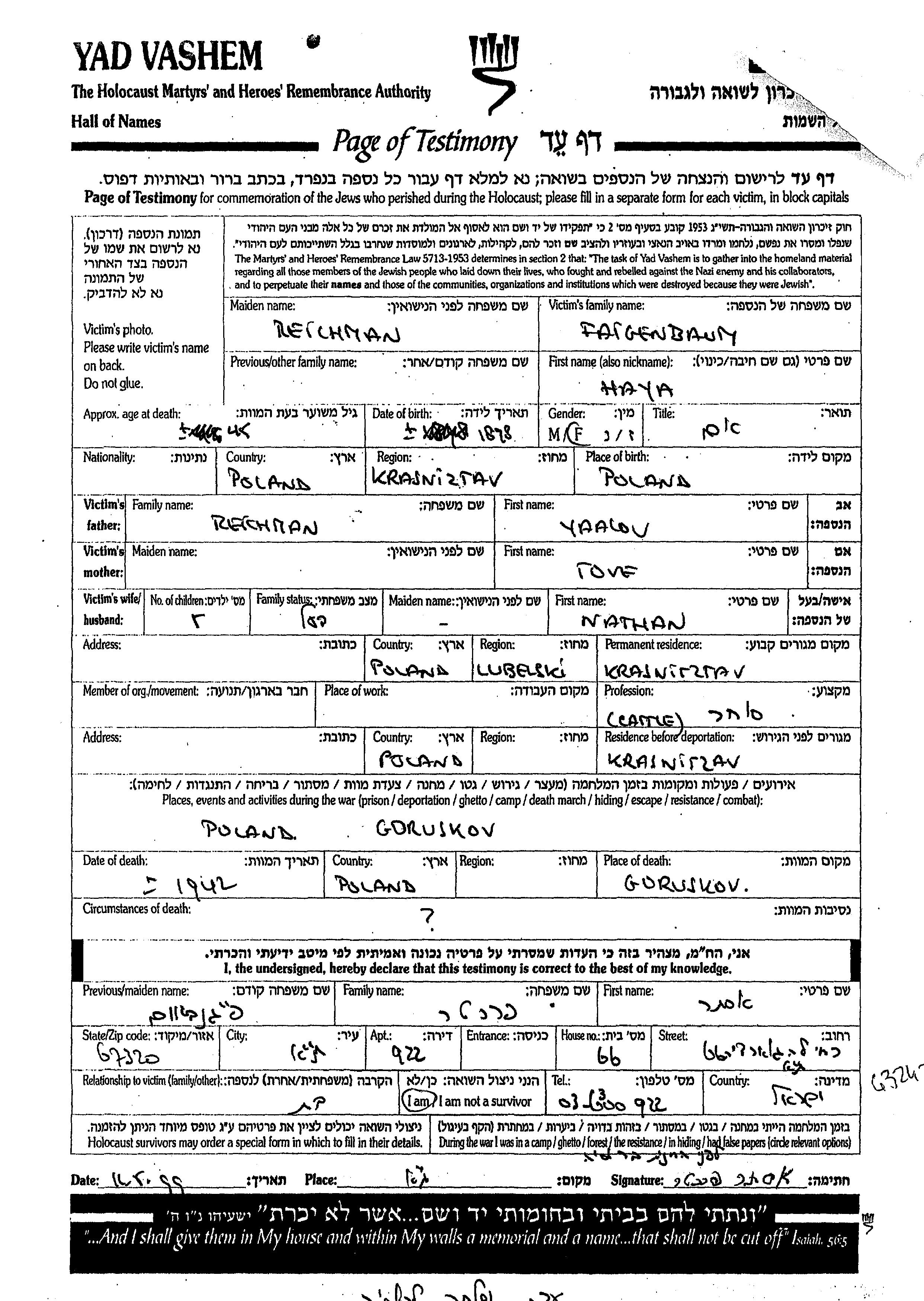 Haya Faigenbaum, geb. Reichman wurde im Jahr 1878 in Krasnistav, Polen geboren. Sie war die Tochter von Yaacov und Tove. Sie war Kaufmann/-frau und mit Nathan Verheiratet. Vor dem Zweiten Weltkrieg lebte sie in Krasnistav, Polen. Während des Krieges war sie in Krasnistav, Polen.