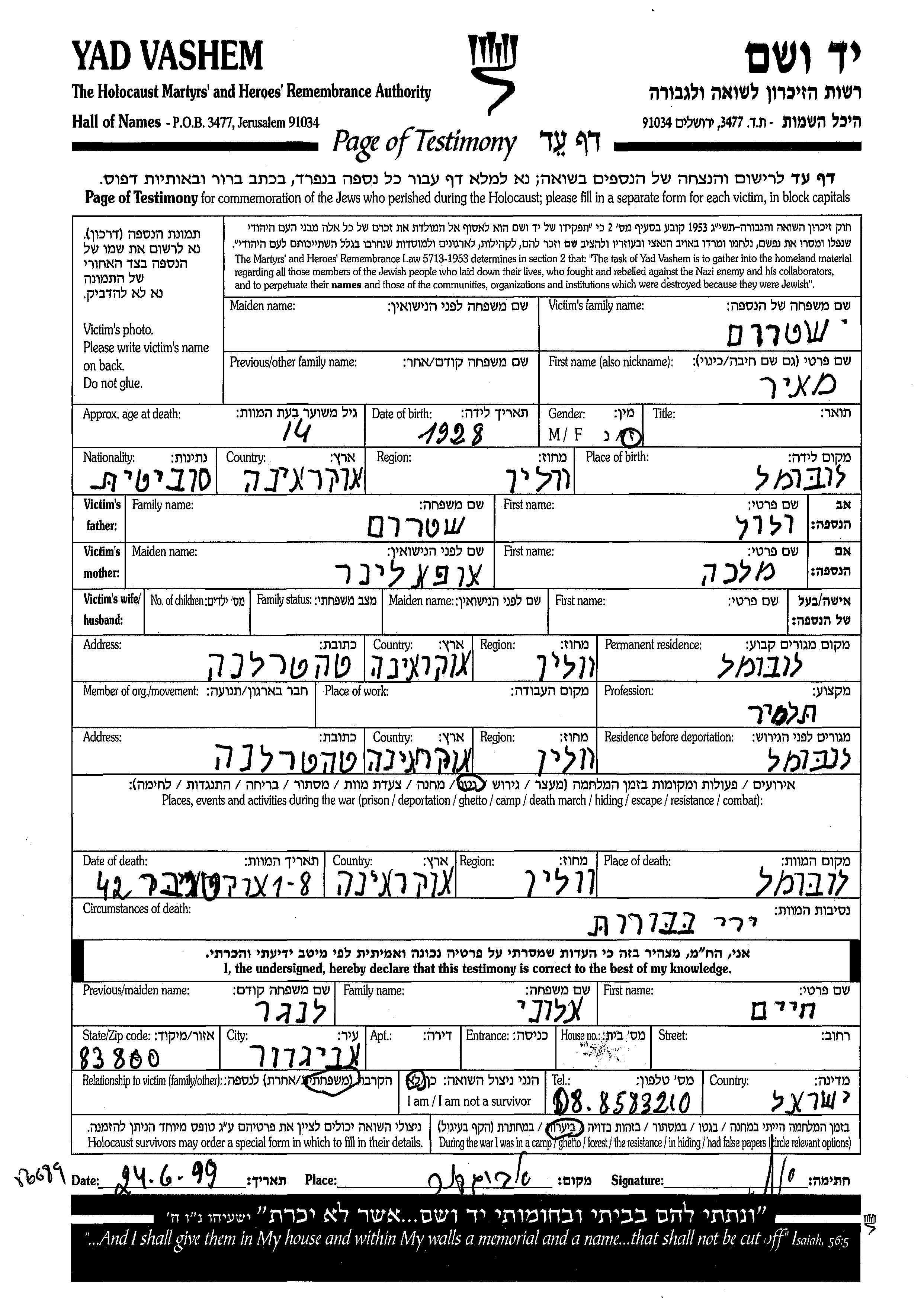 Meir Shtrum wurde im Jahr 1928 in Lubomel, Polen geboren. Er war der Sohn von Volf und Malka. Er war Schüler/-in. Vor dem Zweiten Weltkrieg lebte er in Lubomel, Polen. Während des Krieges war er in Lubomel, Polen.
