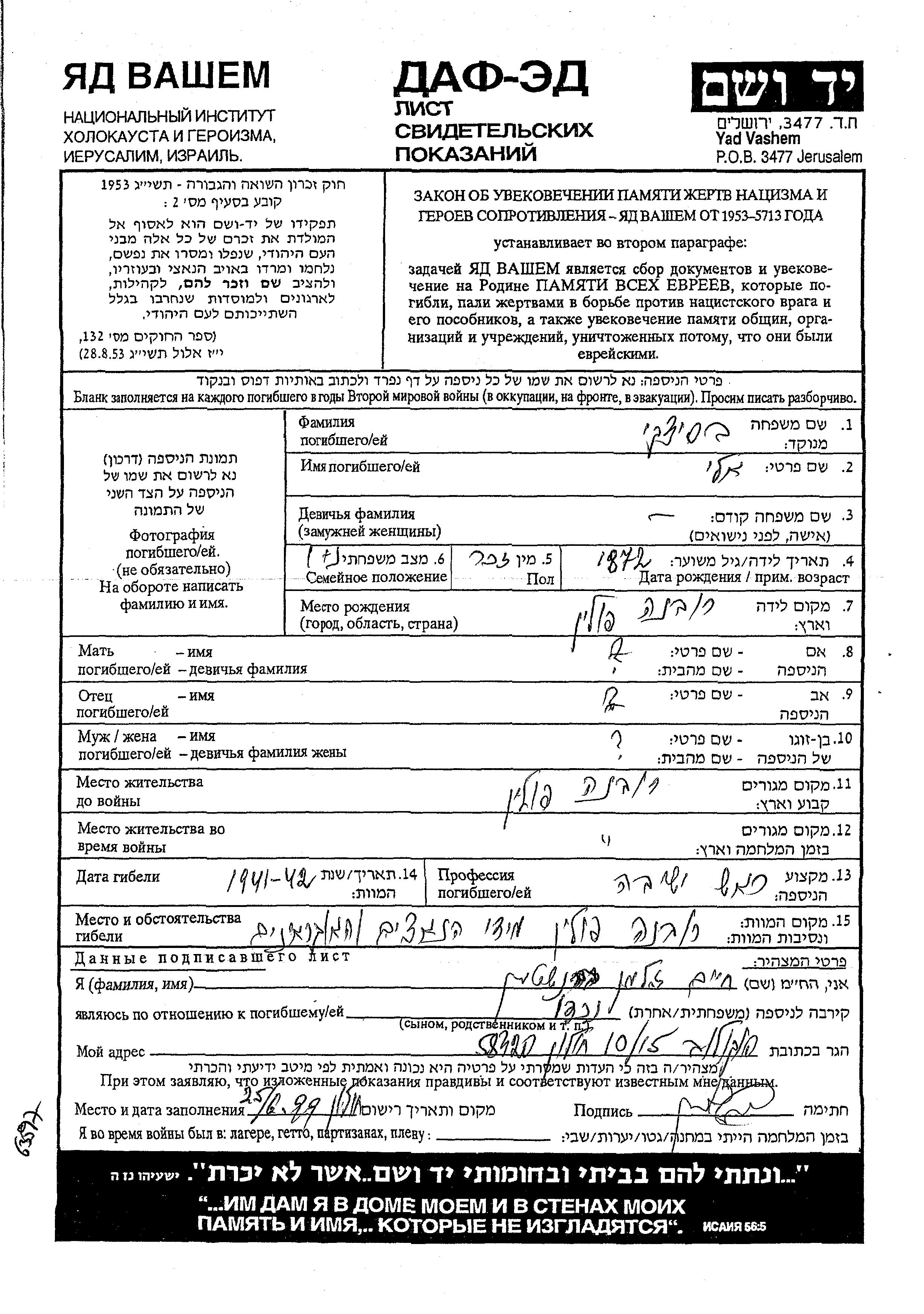 Eli wurde in der Schoah ermordet. Todesort: Rowna, Polen im Jahr 1941.
