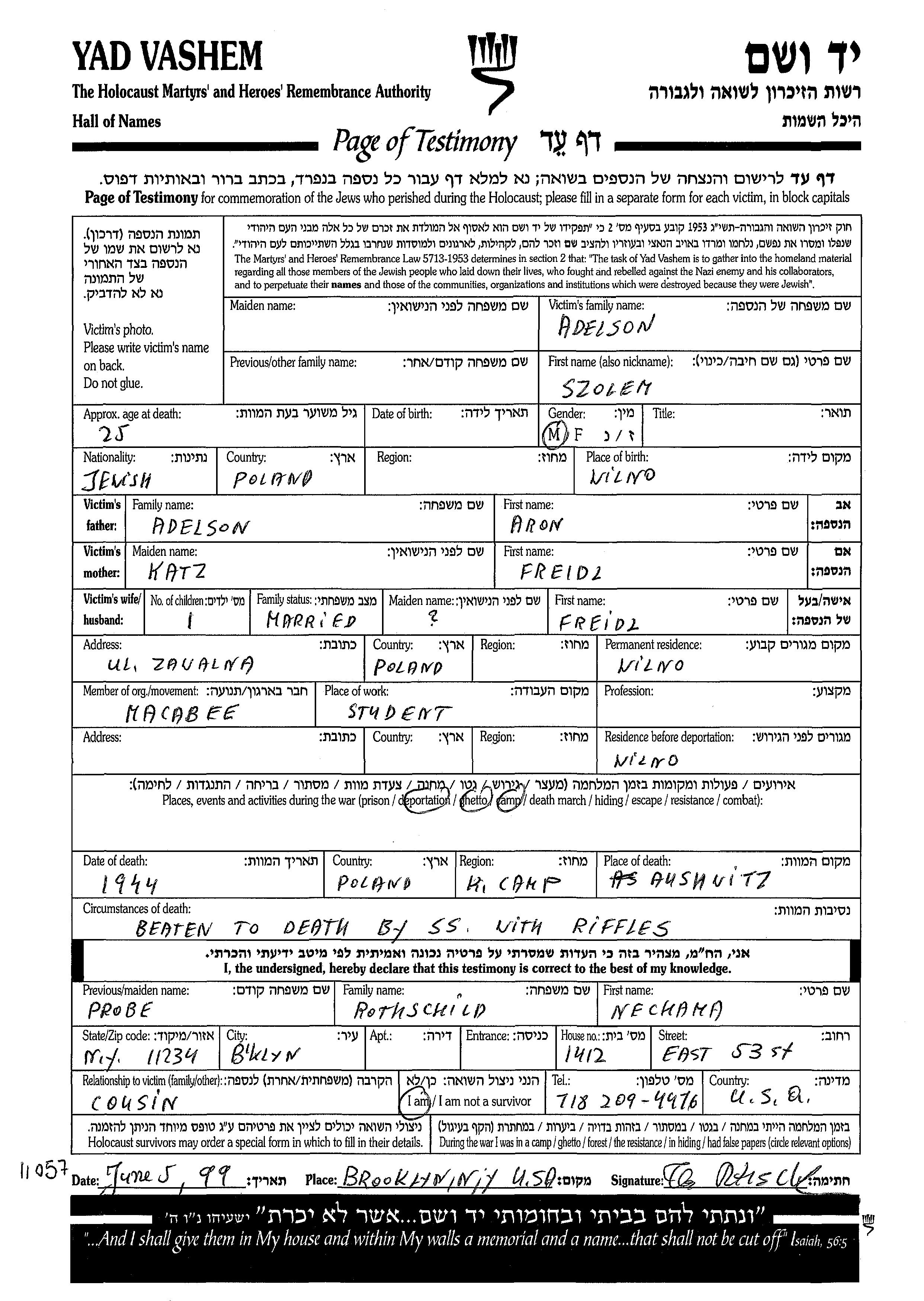 Szolem Adelson wurde in Wilno, Polen geboren. Er war der Sohn von Aron und Freidl. Er war Student und mit Freidl Verheiratet. Vor dem Zweiten Weltkrieg lebte er in Wilno, Polen. Während des Krieges war er in Wilno, Polen.