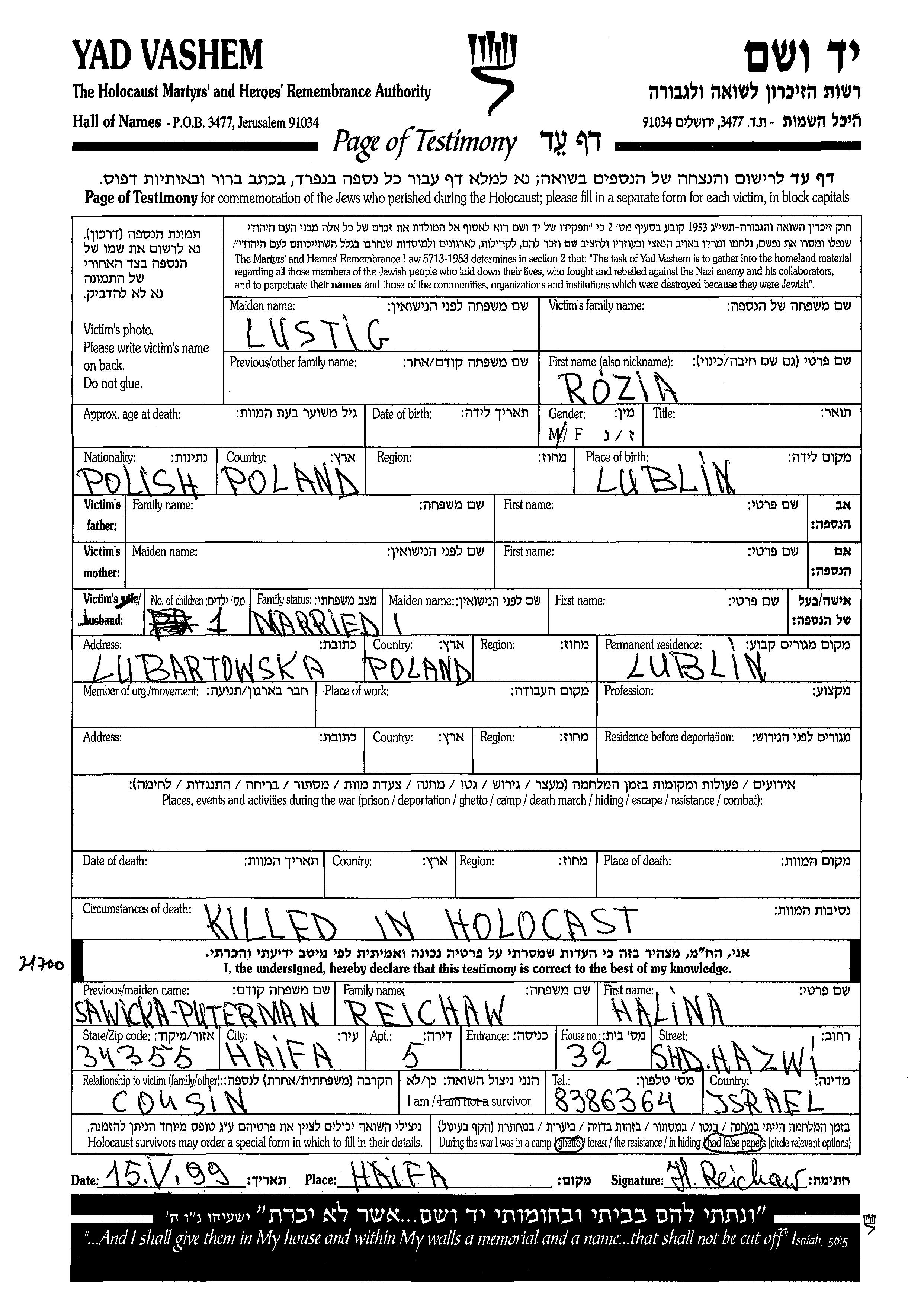 Rozia Name unbekannt, geb. Lustig wurde in Lublin, Polen geboren. Sie war Verheiratet. Vor dem Zweiten Weltkrieg lebte sie in Lublin, Polen.