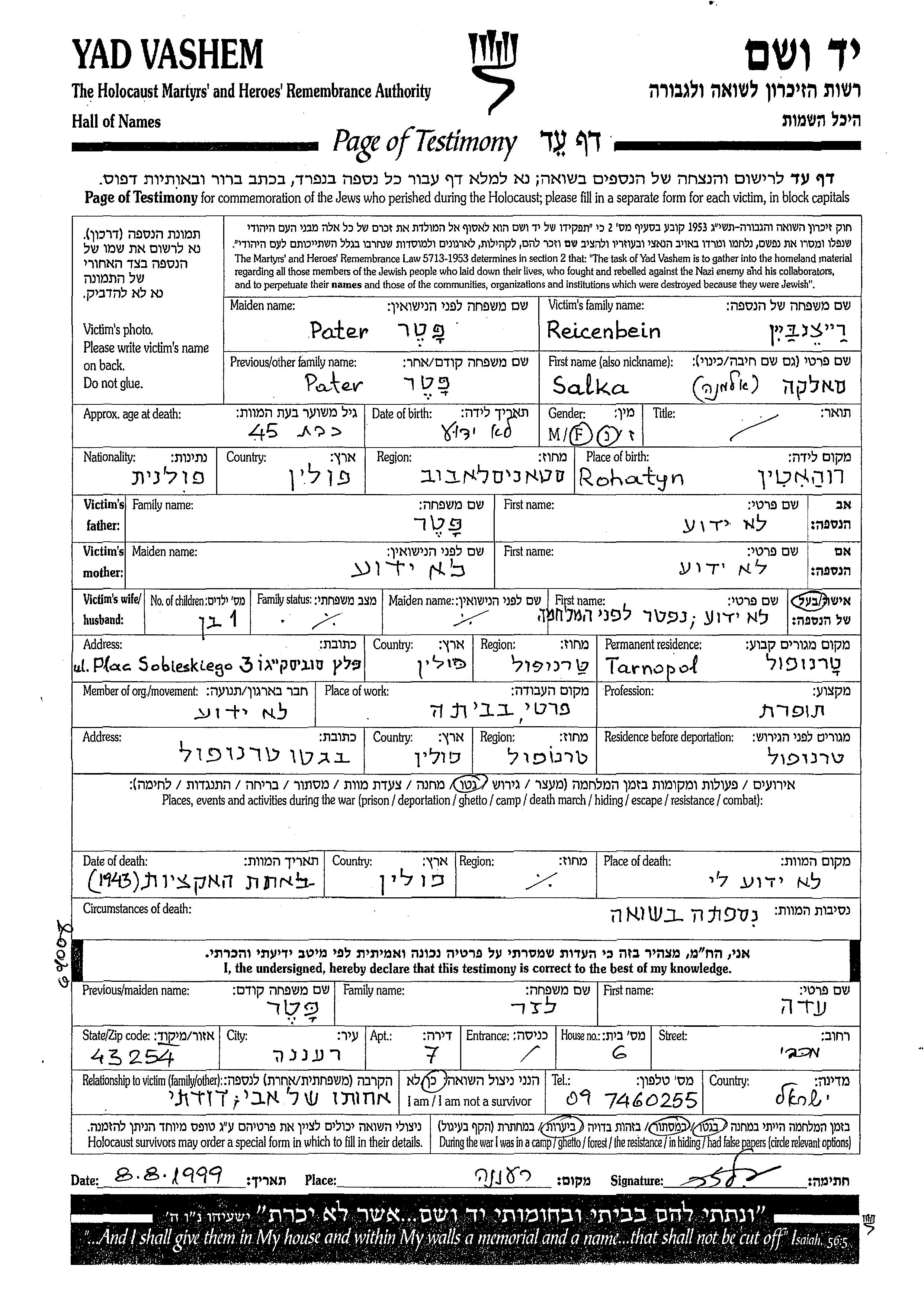 Salka Reicenbein, geb. Pater Fater wurde in Rohatyn, Polen geboren. Sie war Schneiderin. Vor dem Zweiten Weltkrieg lebte sie in Tarnopol, Polen. Während des Krieges war sie in Tarnopol, Polen.