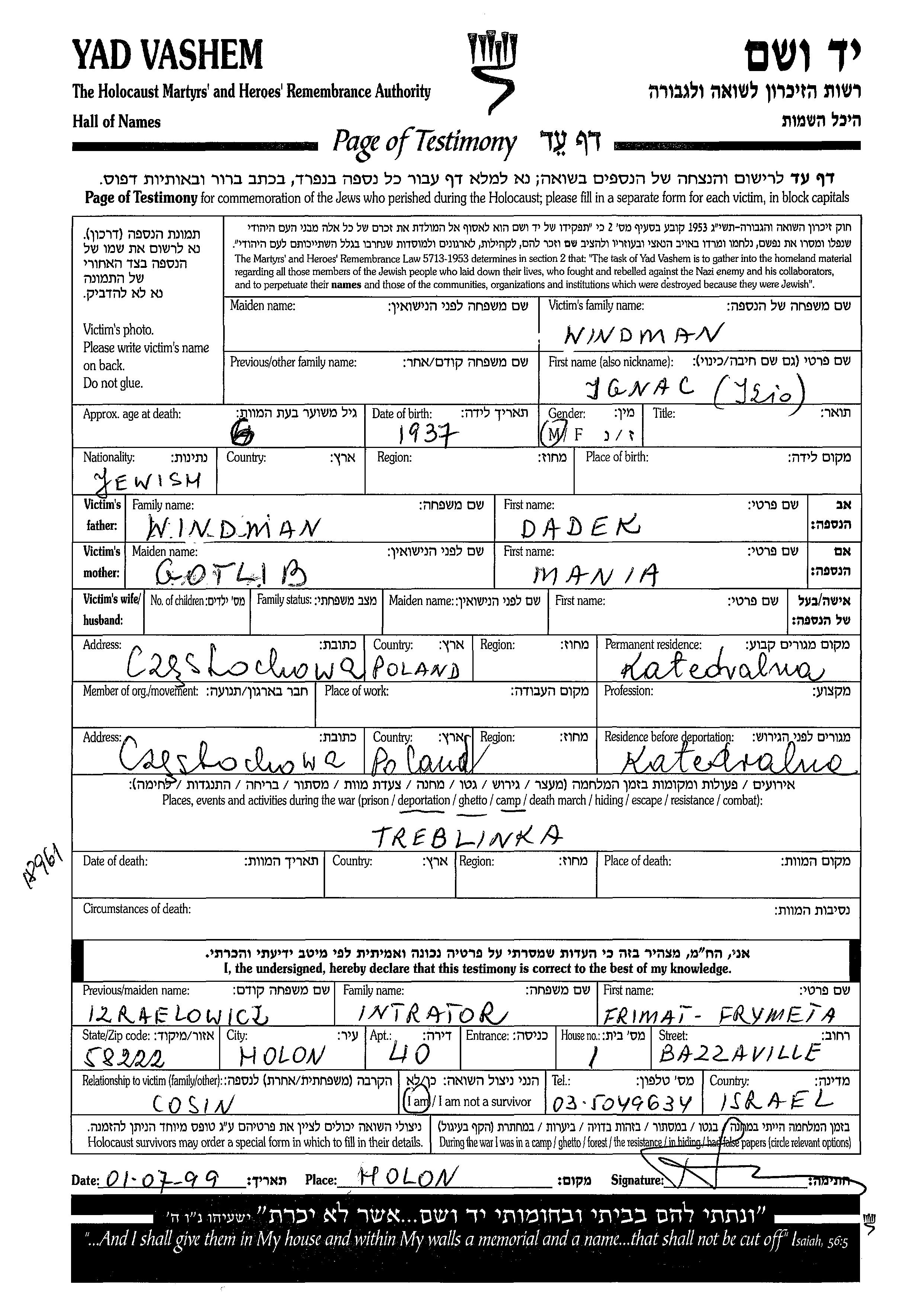 Ignac Izio Windman wurde im Jahr 1937 geboren. Er war der Sohn von Dadek und Mania. Er war Kind. Vor dem Zweiten Weltkrieg lebte er in Czestochowa, Polen. Während des Krieges war er in Czestochowa, Polen.