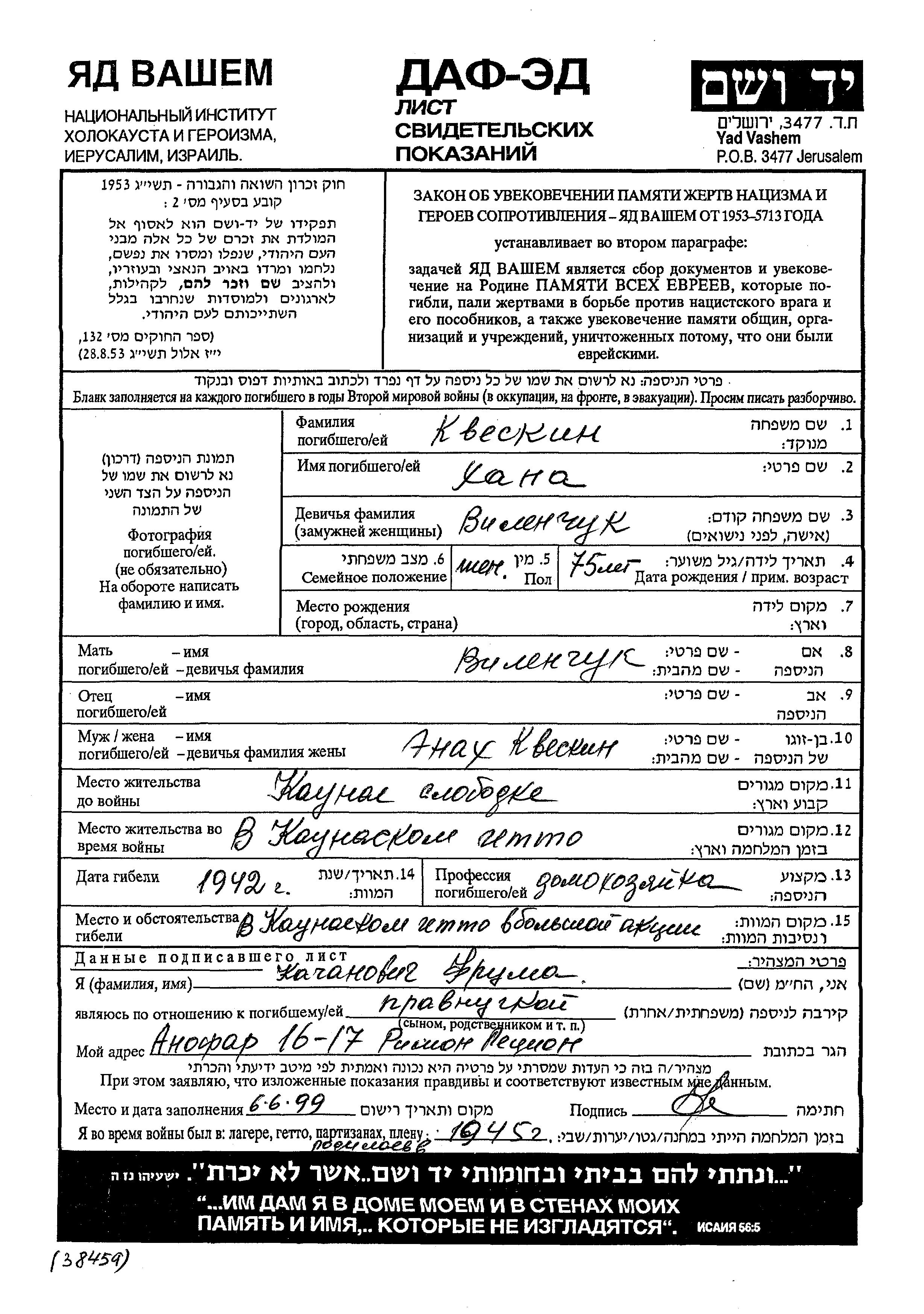 Khana Kveskin, geb. Vilenchuk. Sie war Hausfrau und mit Enakh Verheiratet. Vor dem Zweiten Weltkrieg lebte sie in Kaunas Slobodka, Litauen. Während des Krieges war sie in Kaunas, Litauen.