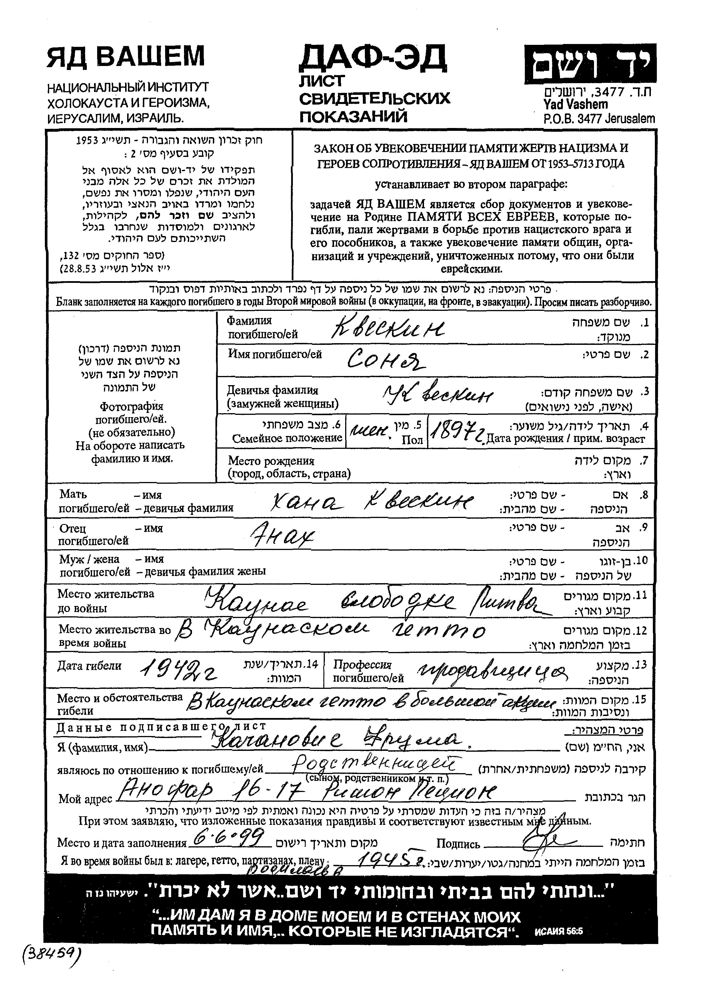 Sonya Kveskin, geb. Kveskin wurde im Jahr 1897 geboren. Sie war die Tochter von Enakh und Khana. Sie war Verkäufer/-in. Vor dem Zweiten Weltkrieg lebte sie in Slobodke, Litauen. Während des Krieges war sie in Kaunas, Litauen.