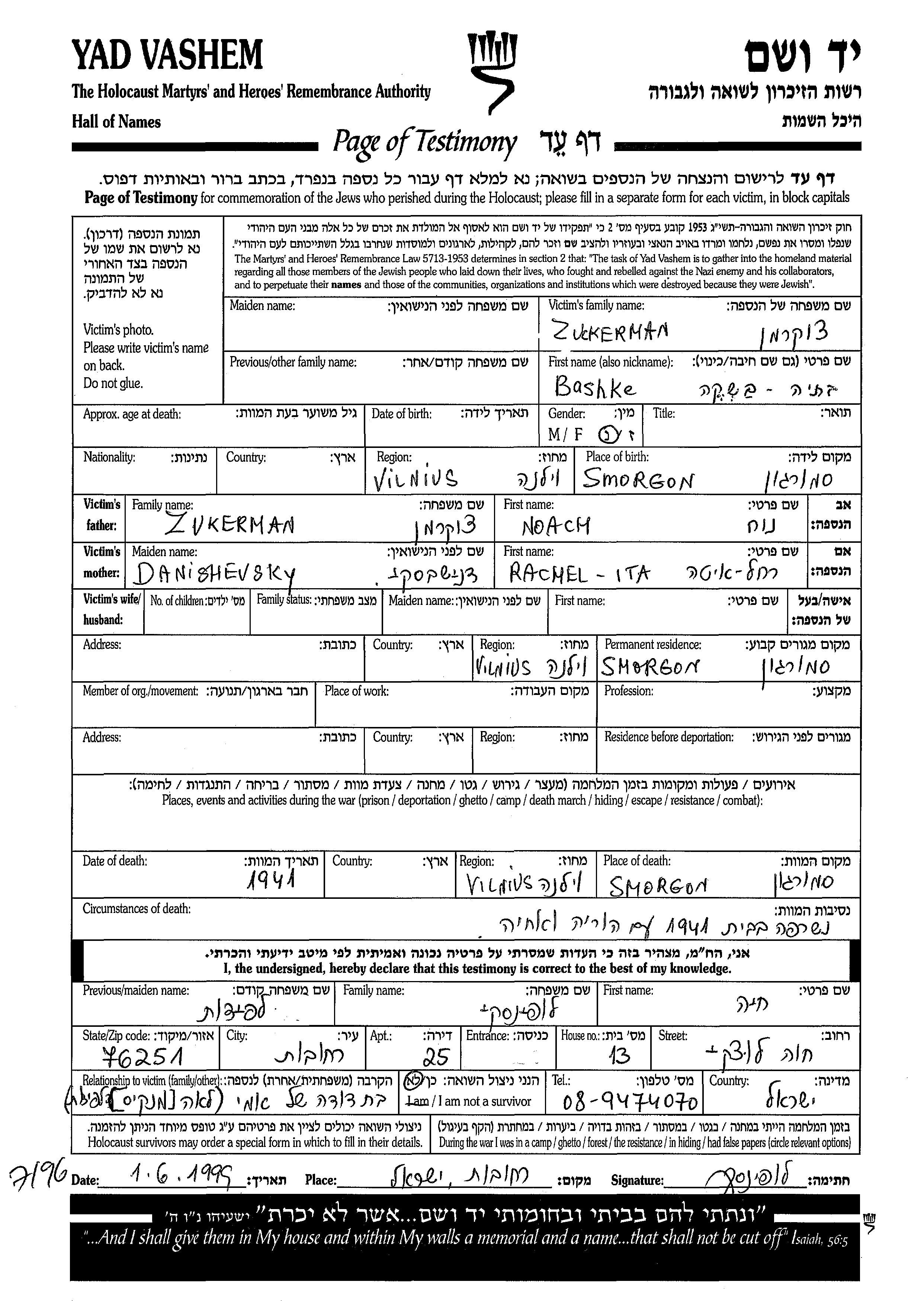 Bashke wurde in der Schoah ermordet. Todesort: Smorgon, Polen im Jahr 1941.