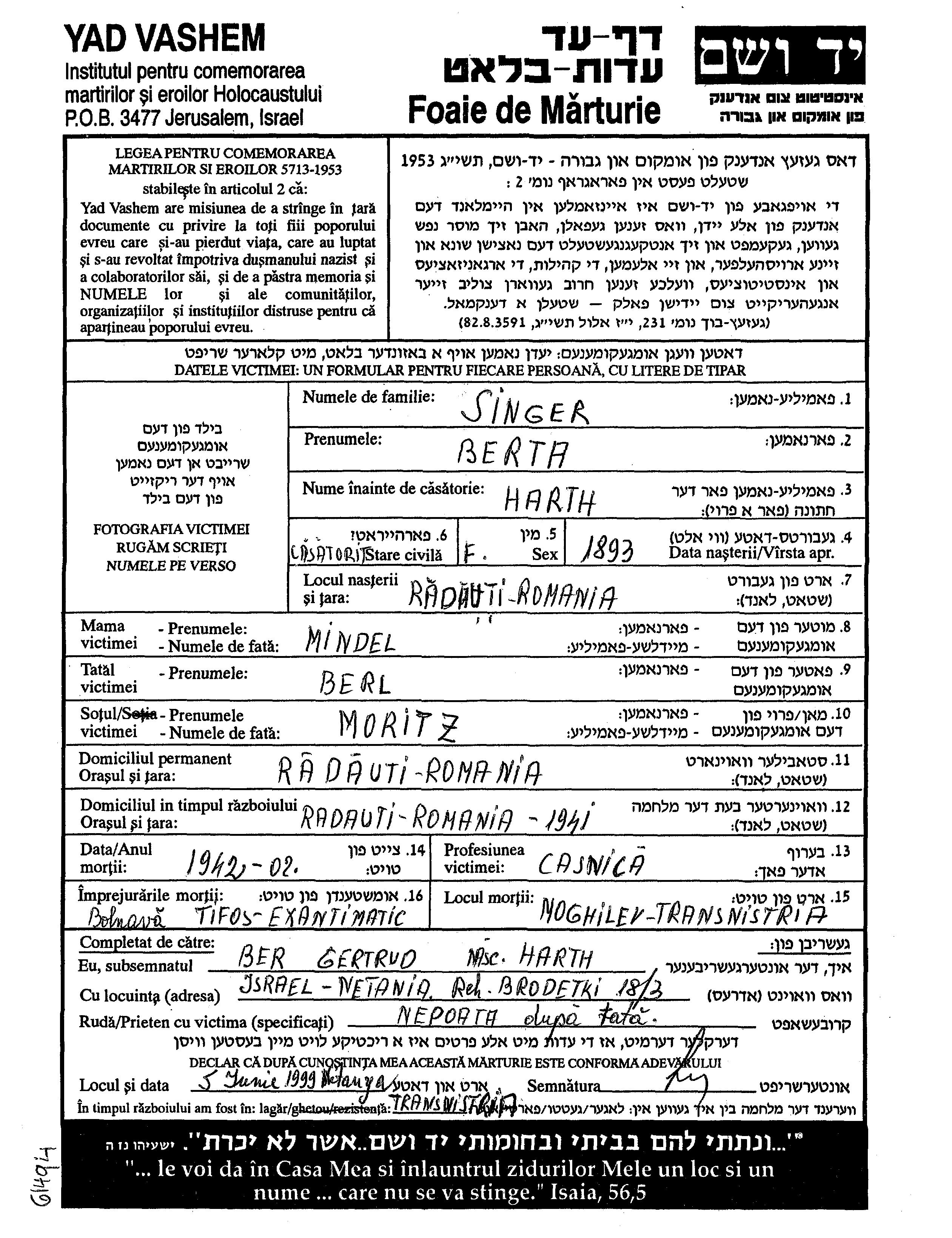 Berta wurde in der Schoah ermordet. Todesort: Mogilev Podolski, Ukraine (UdSSR) im Jahr 1942.