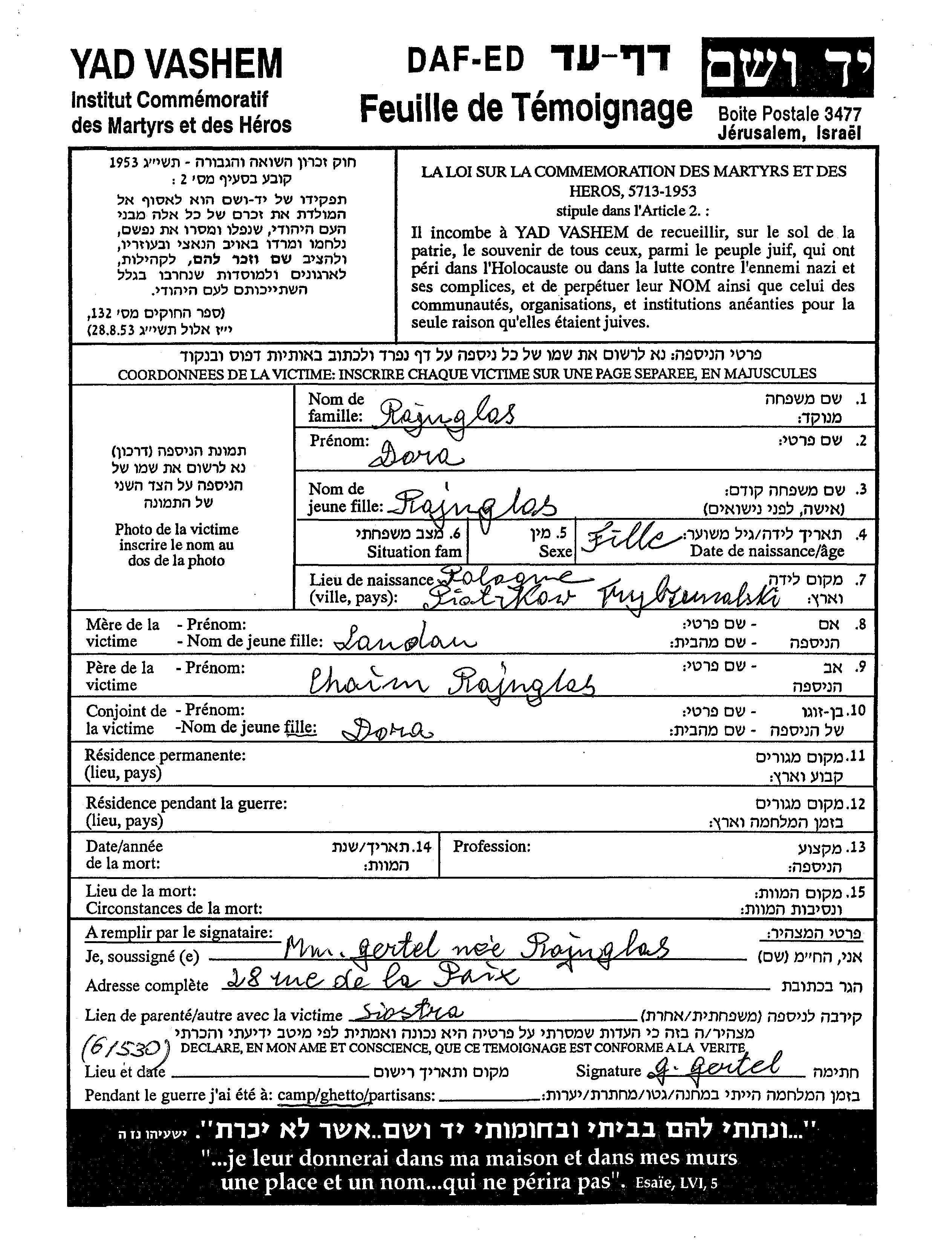 Dora Rajnglas wurde in Piotrkow Trybunalski, Polen geboren. Sie war die Tochter von Chaim.