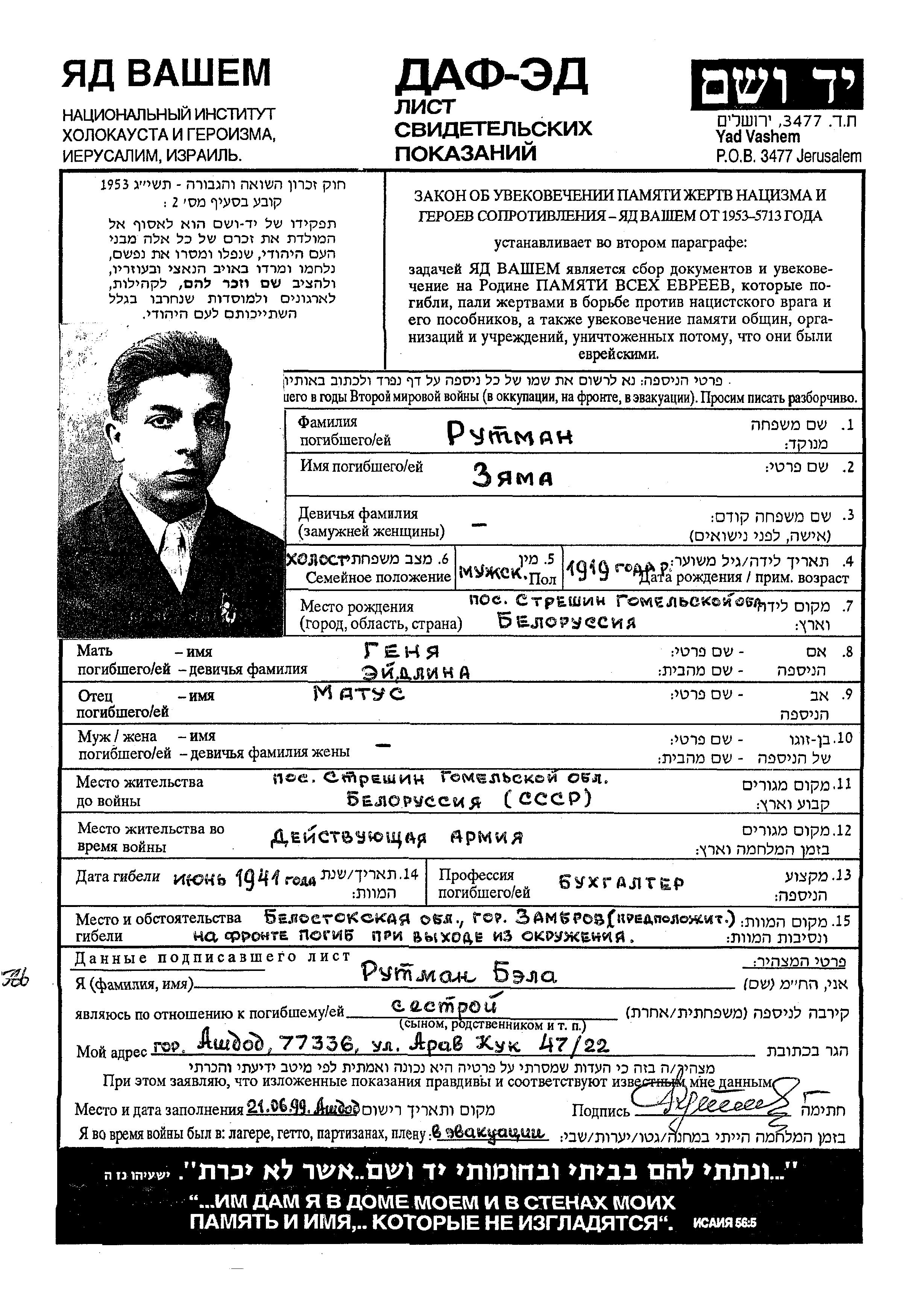 Zyama Rutman wurde im Jahr 1919 in Streshin, Weißrussland (UdSSR) geboren. Er war der Sohn von Matus und Genya. Er war Buchhalter/-in und Ledig. Vor dem Zweiten Weltkrieg lebte er in Streshin, Weißrussland (UdSSR). Während des Krieges war er in die Sowjetischen Streitkräfte. Zyama im Militärdienst umgekommen. Todesort: Zambrow, Polen im Jahr 1941.