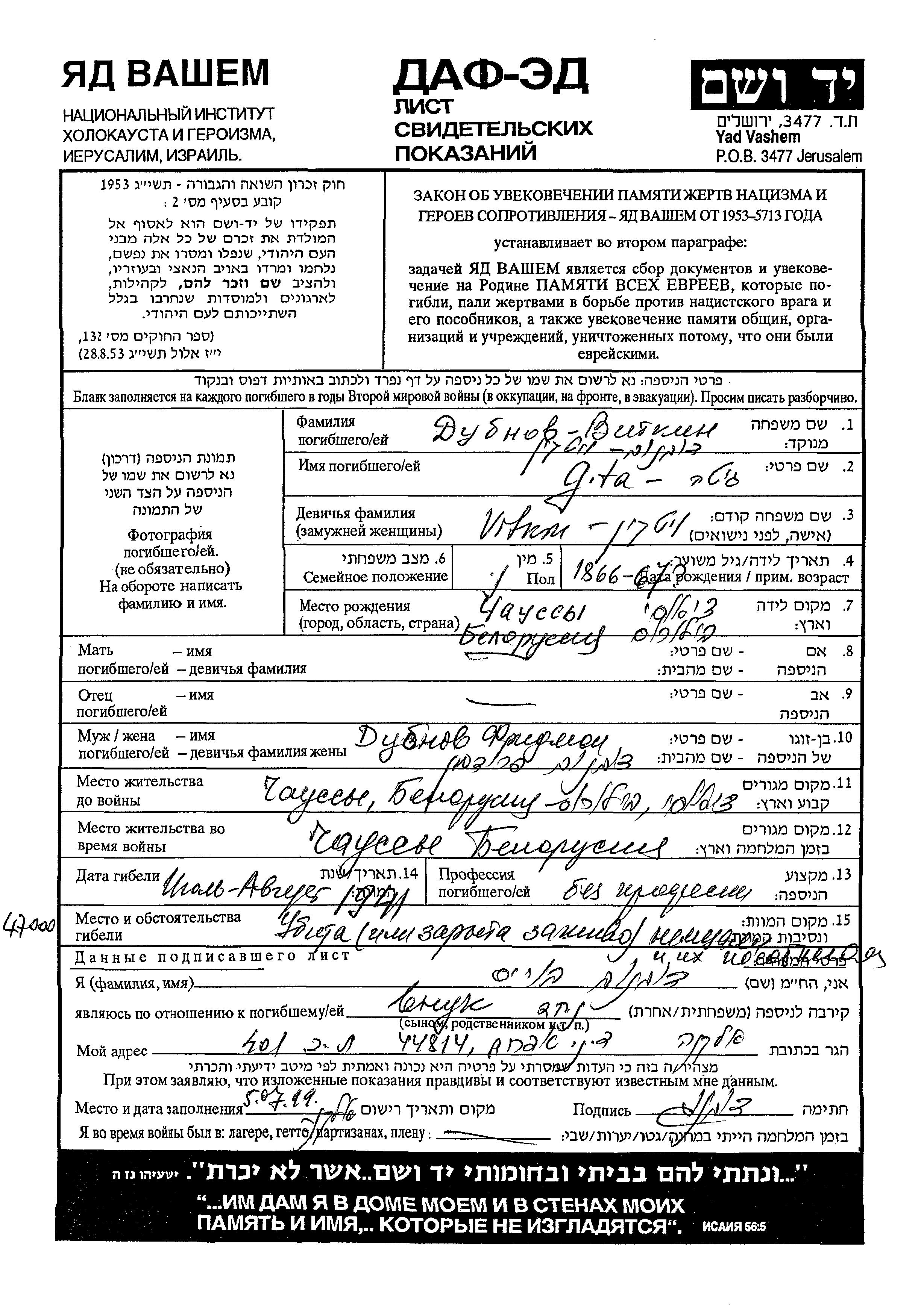 Gita Dubnov, geb. Vitkin wurde im Jahr 1866 in Chaussy, Weißrussland (UdSSR) geboren. Vor dem Zweiten Weltkrieg lebte sie in Chaussy, Weißrussland (UdSSR). Während des Krieges war sie in Chaussy, Weißrussland (UdSSR).