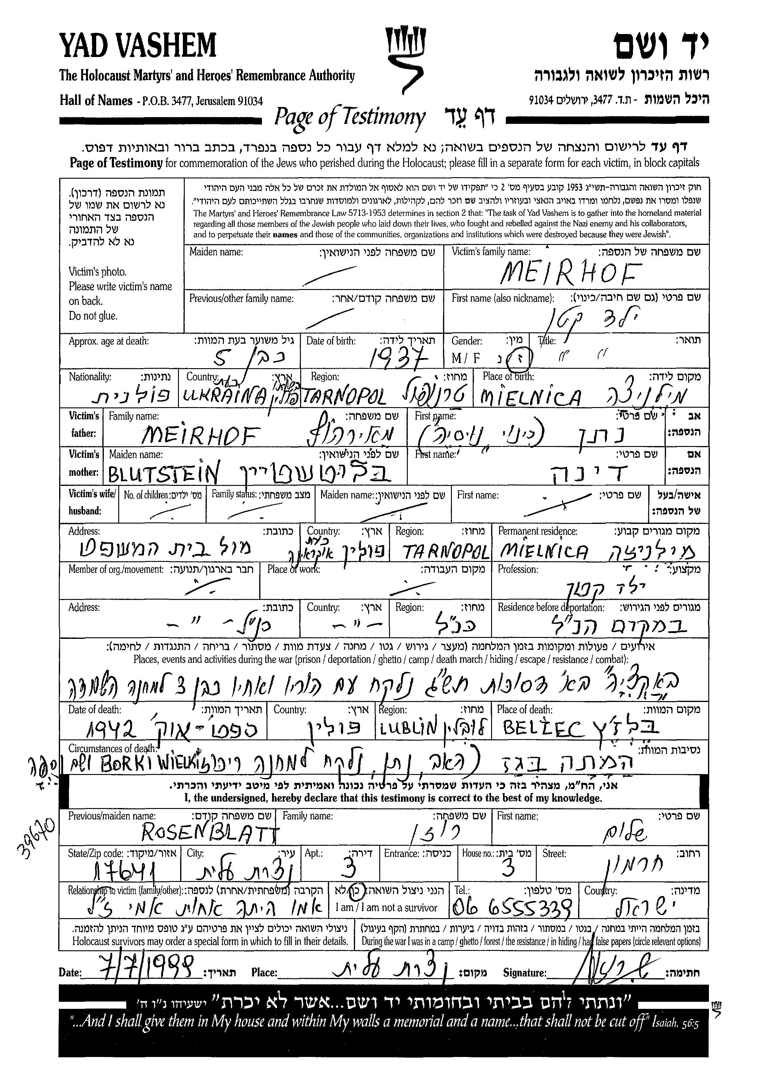 Vorname unbekannt Meirhof wurde im Jahr 1937 in Mielnica, Polen geboren. Er war der Sohn von Natan Nusia und Dina. Er war Kind. Vor dem Zweiten Weltkrieg lebte er in Mielnica, Polen. Während des Krieges war er in Mielnica, Polen.