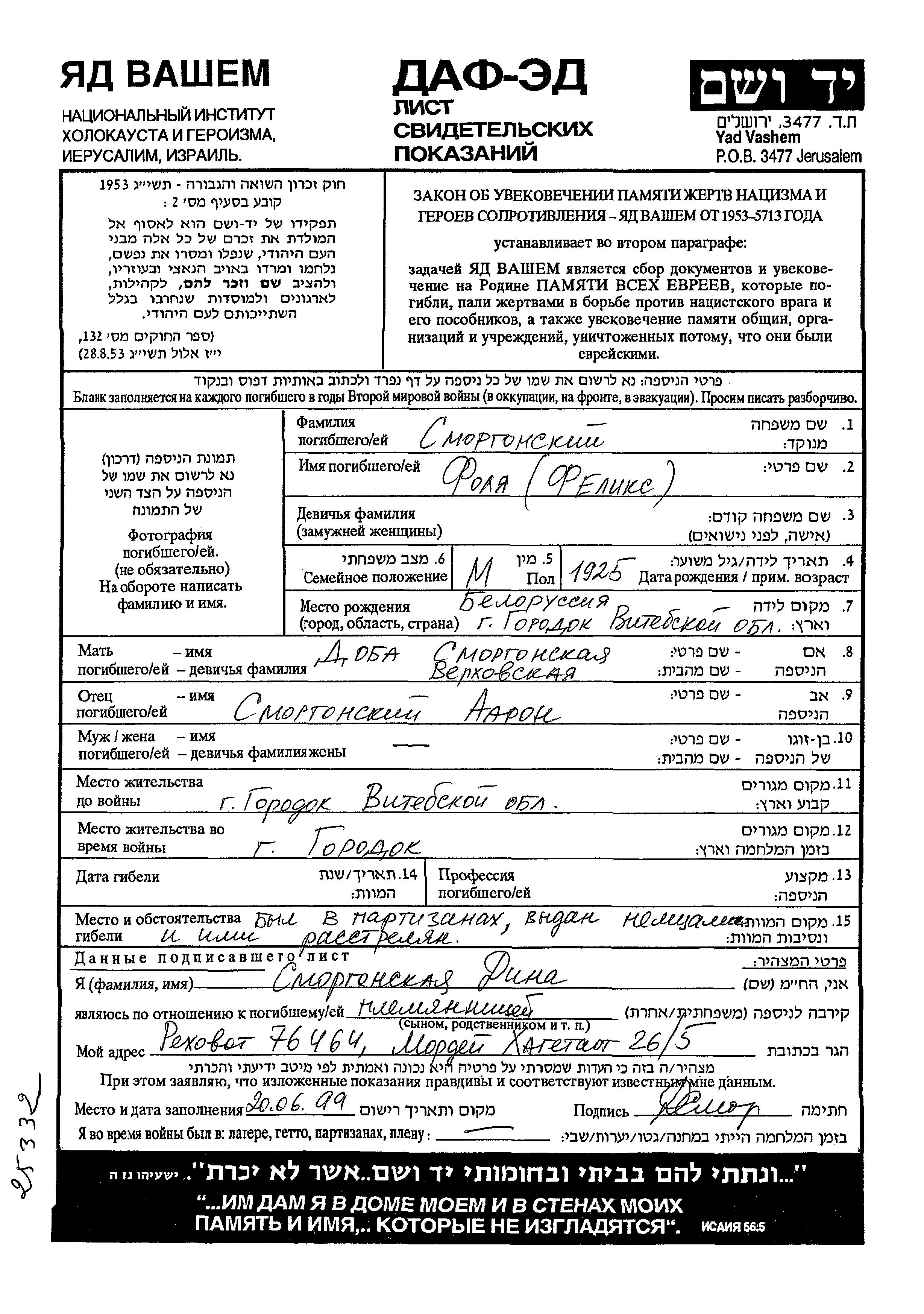 Folya Feliks Smorgonski wurde im Jahr 1925 in Gorodok geboren. Er war der Sohn von Aaron und Doba. Vor dem Zweiten Weltkrieg lebte er in Gorodok. Während des Krieges war er in Gorodok.