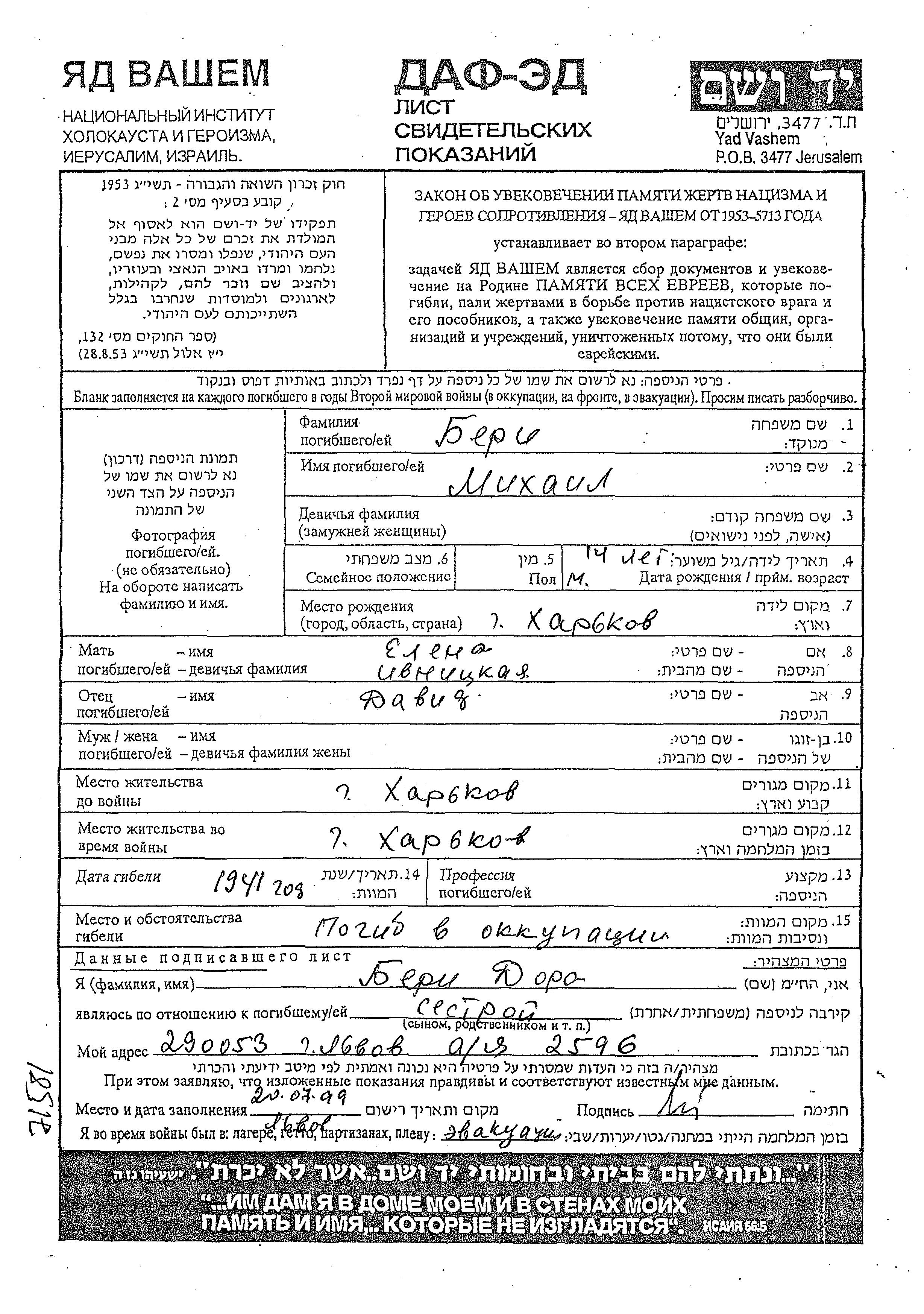 Mikhail wurde in der Schoah ermordet. Todesort: Kharkov, Ukraine (UdSSR) im Jahr 1941.