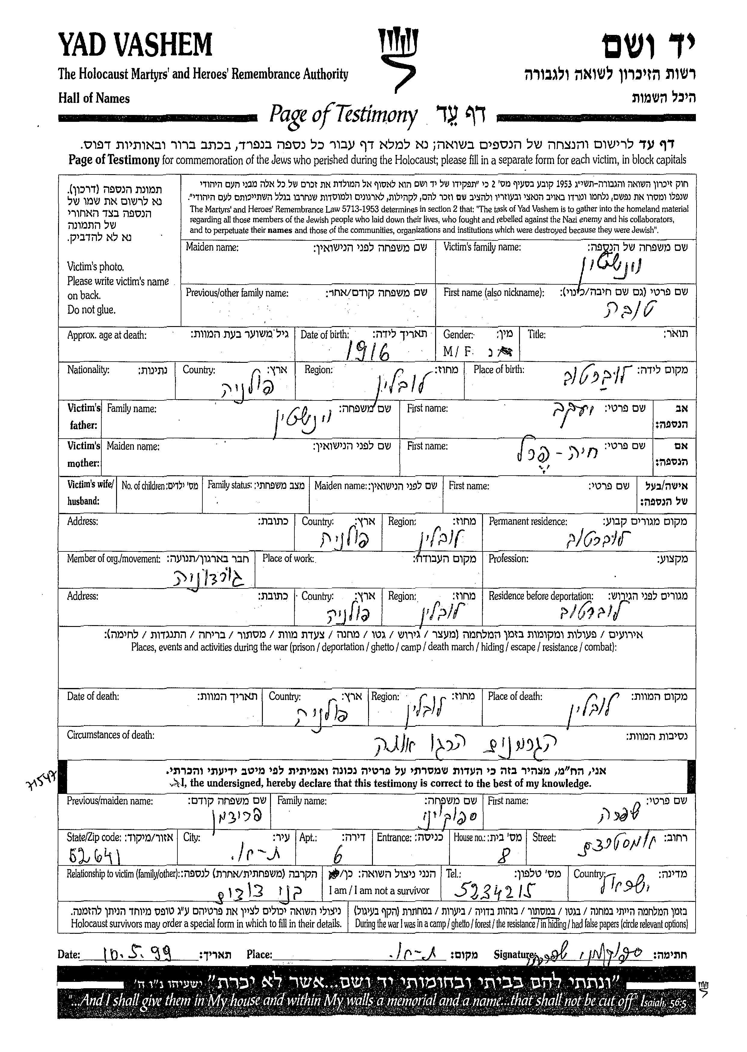 Veinshtein Tova 1916 Lubartov, Polen Gedenkblatt