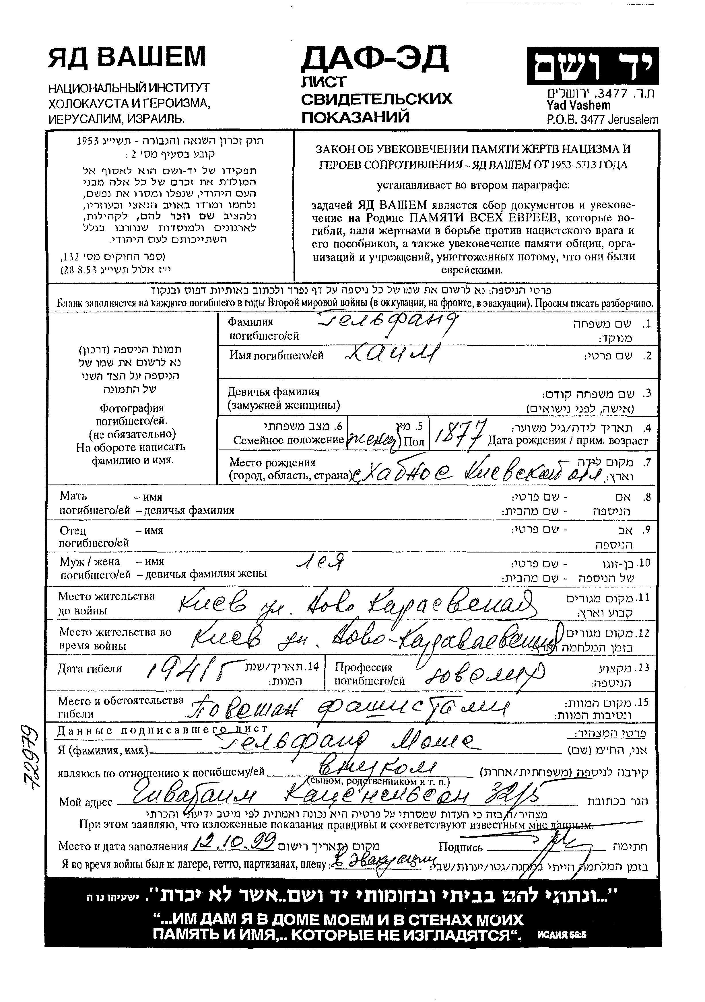 Khaim Gelfand wurde im Jahr 1877 in Khabnoye, Ukraine (UdSSR) geboren. Er war Juwelier und mit Leya Verheiratet. Vor dem Zweiten Weltkrieg lebte er in Kiev, Ukraine (UdSSR). Während des Krieges war er in Kiev, Ukraine (UdSSR).