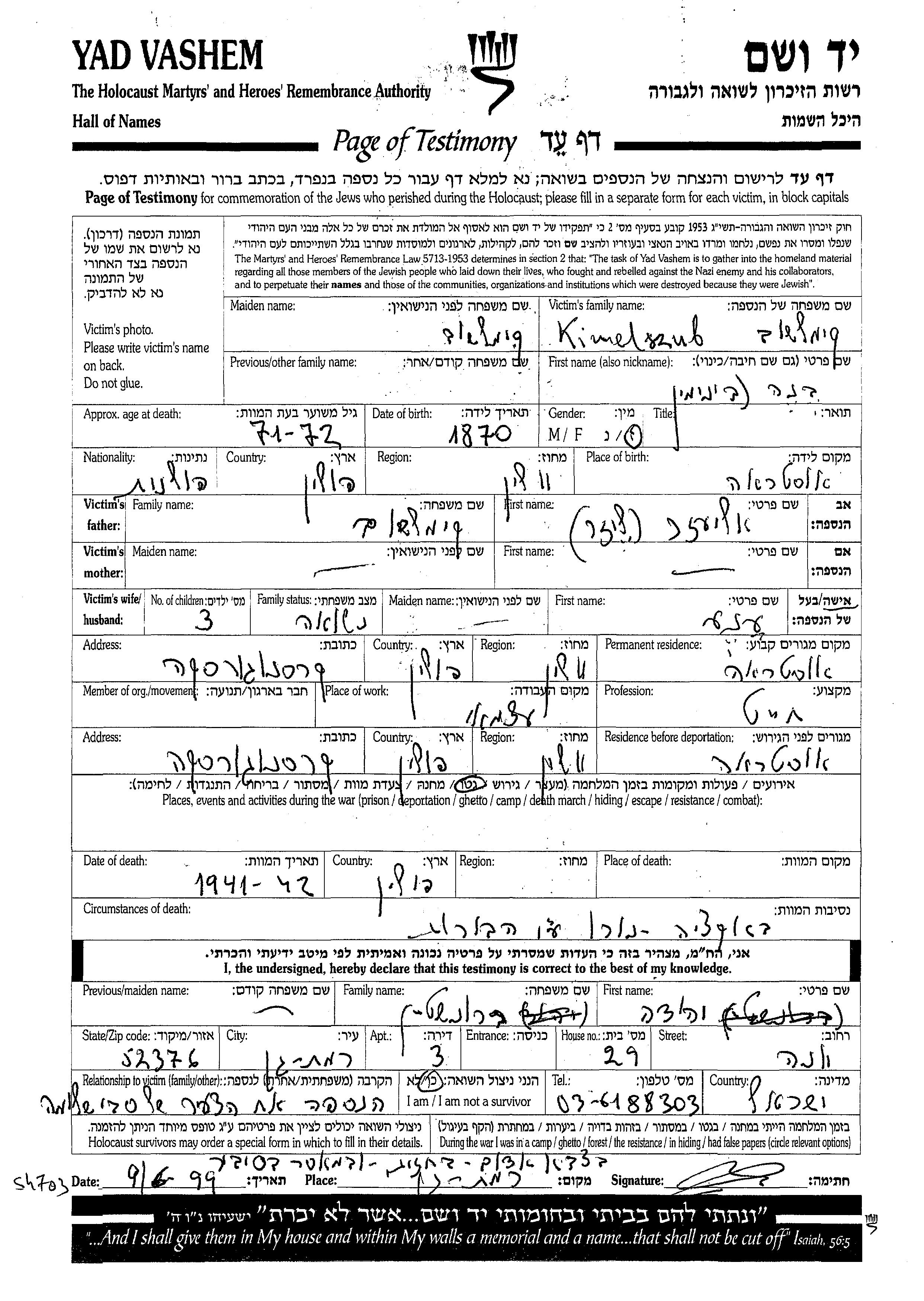 Bene Kimelszub wurde im Jahr 1870 in Ostraha, Polen geboren. Er war der Sohn von Eliezer. Er war Schneider und mit Ene Verheiratet. Vor dem Zweiten Weltkrieg lebte er in Ostraha, Polen. Während des Krieges war er in Ostraha, Polen.