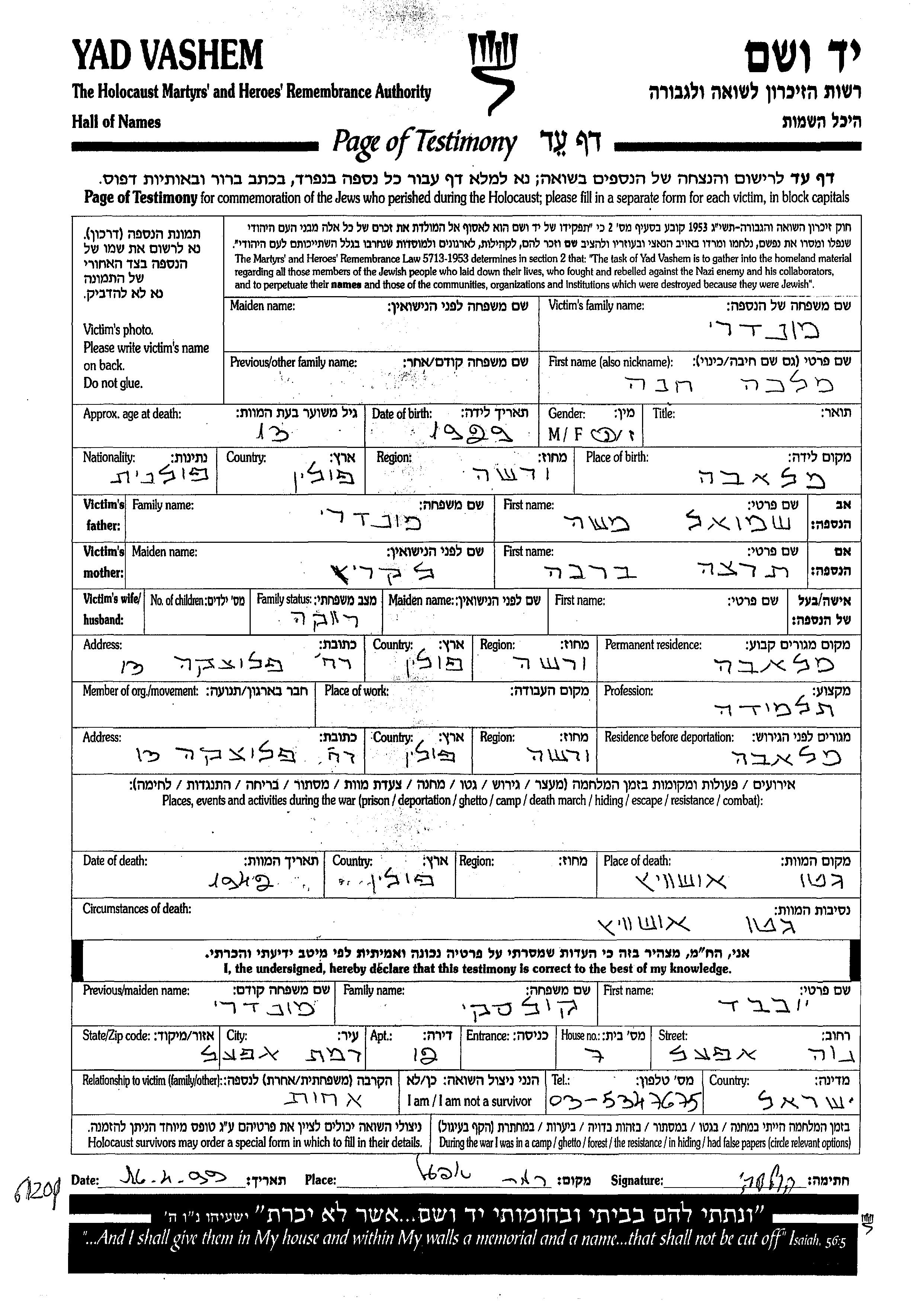 Malka Mondri wurde im Jahr 1929 in Mlawa, Polen geboren. Sie war die Tochter von Shmuel Moshe und Tirtza Brakha. Sie war Schüler/-in und Kind. Vor dem Zweiten Weltkrieg lebte sie in Mlawa, Polen. Während des Krieges war sie in Mlawa, Polen.