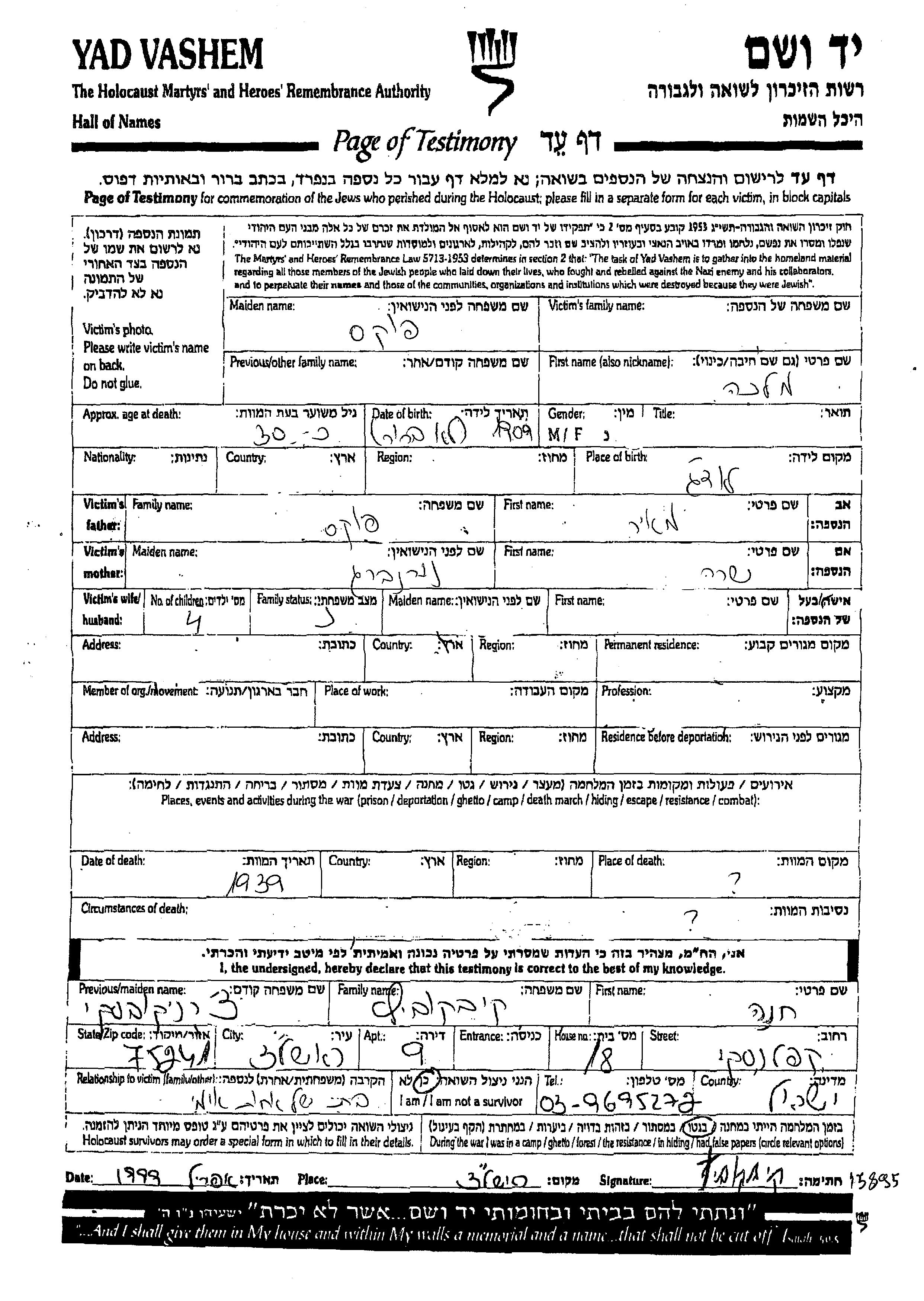 Malka wurde in der Schoah ermordet. Todesort: unbekannt im Jahr 1939.