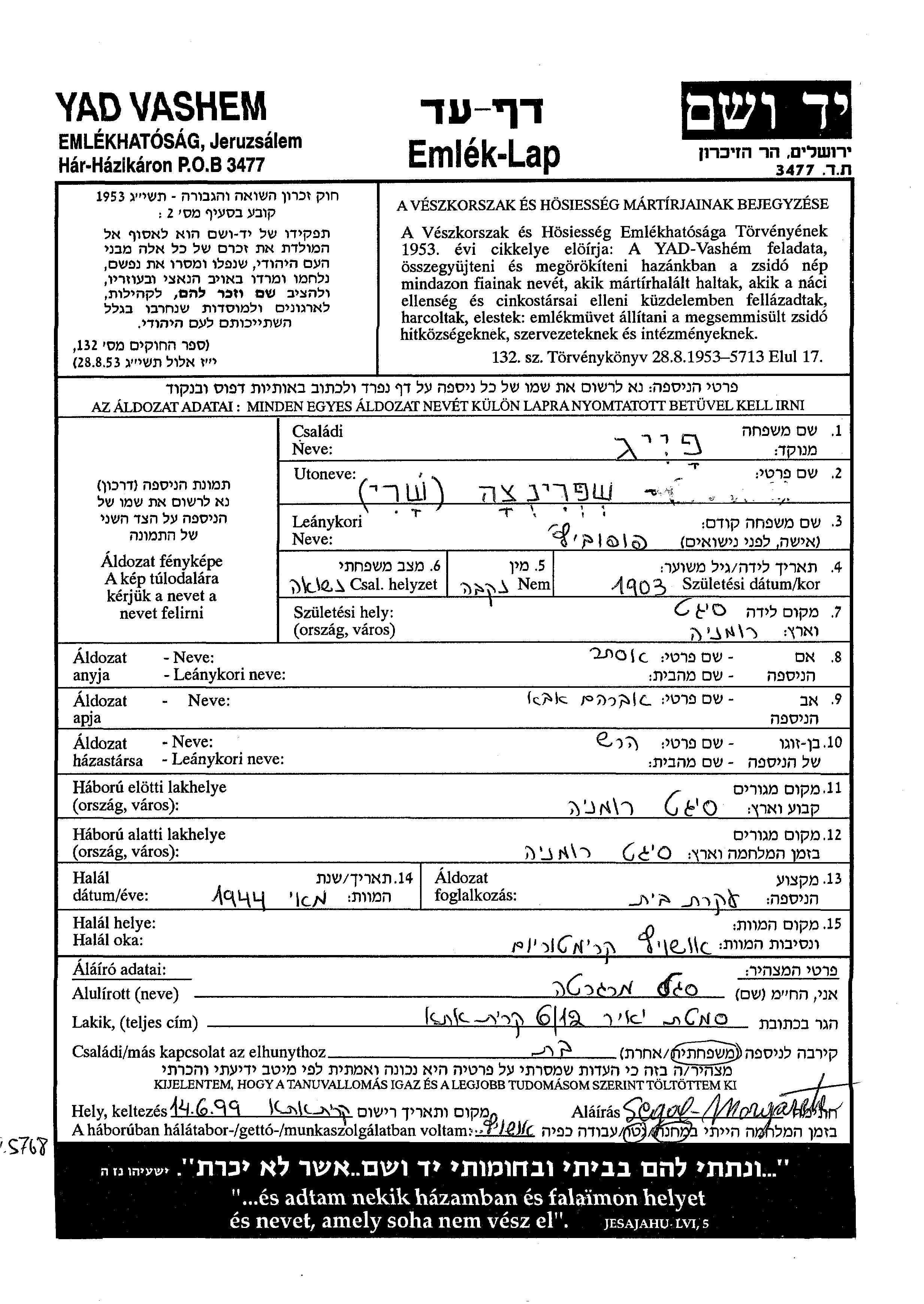 Shprintza wurde in der Schoah ermordet. Todesort: Auschwitz, Polen im Jahr 05/1944.