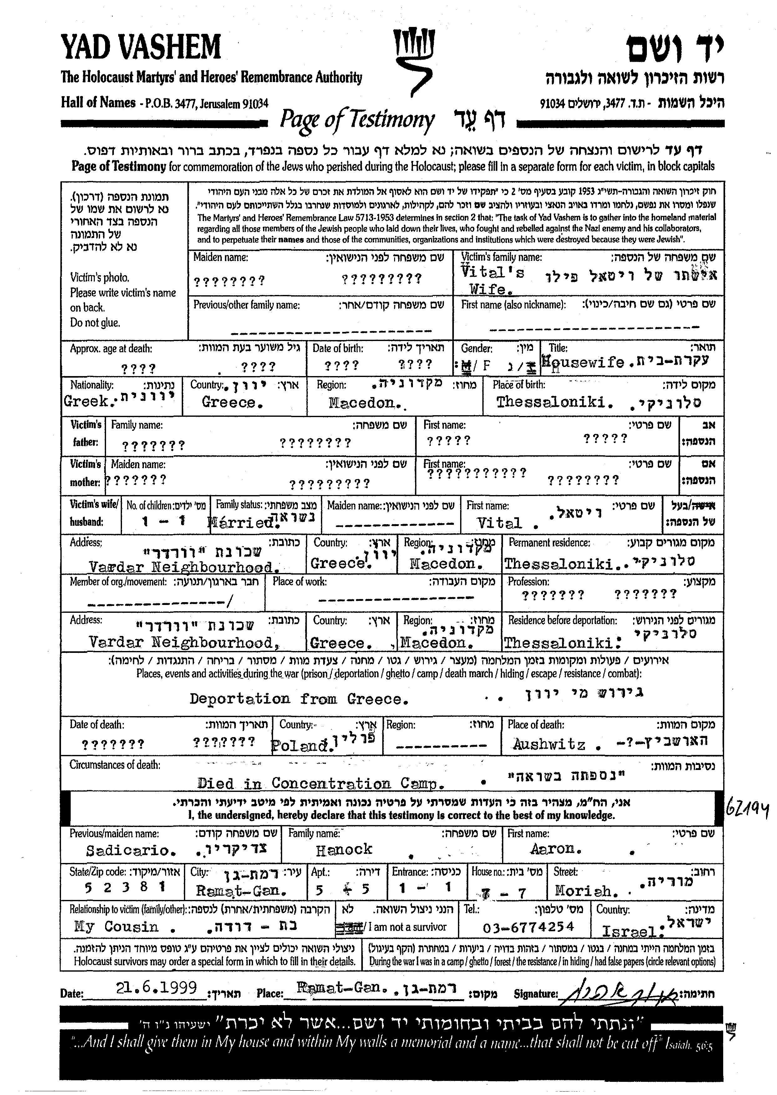 Vorname unbekannt Name unbekannt wurde in Thessaloniki, Griechenland geboren. Er war mit Vital Verheiratet. Vor dem Zweiten Weltkrieg lebte er in Thessaloniki, Griechenland. Während des Krieges war er in Thessaloniki, Griechenland.