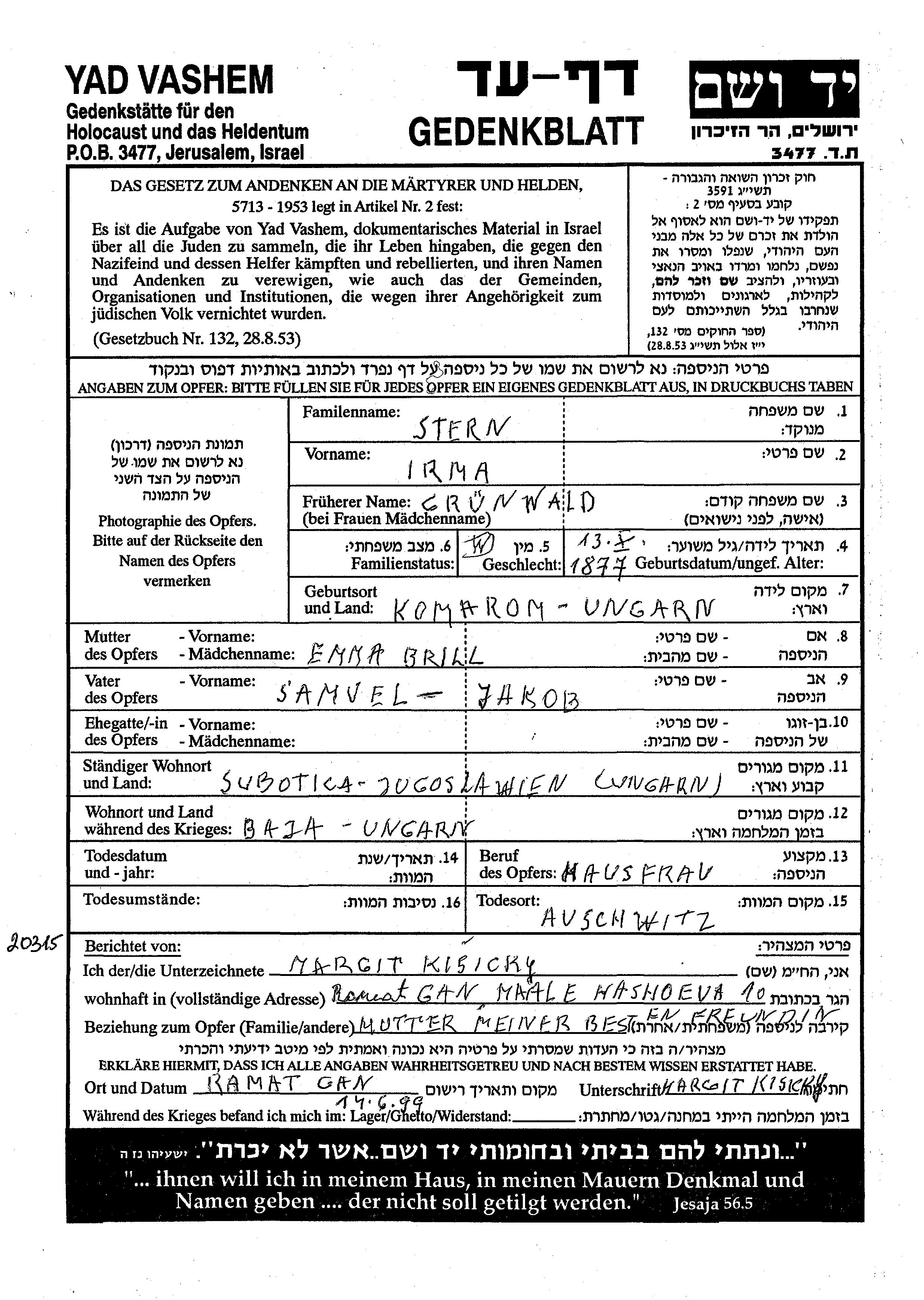 Irma Stern, geb. Grünwald wurde im Jahr 1877 in Komarom, Ungarn geboren. Sie war die Tochter von Jakob Samuel und Emma. Sie war Hausfrau und Witwe. Vor dem Zweiten Weltkrieg lebte sie in Subotica, Jugoslawien. Während des Krieges war sie in Baja, Ungarn.